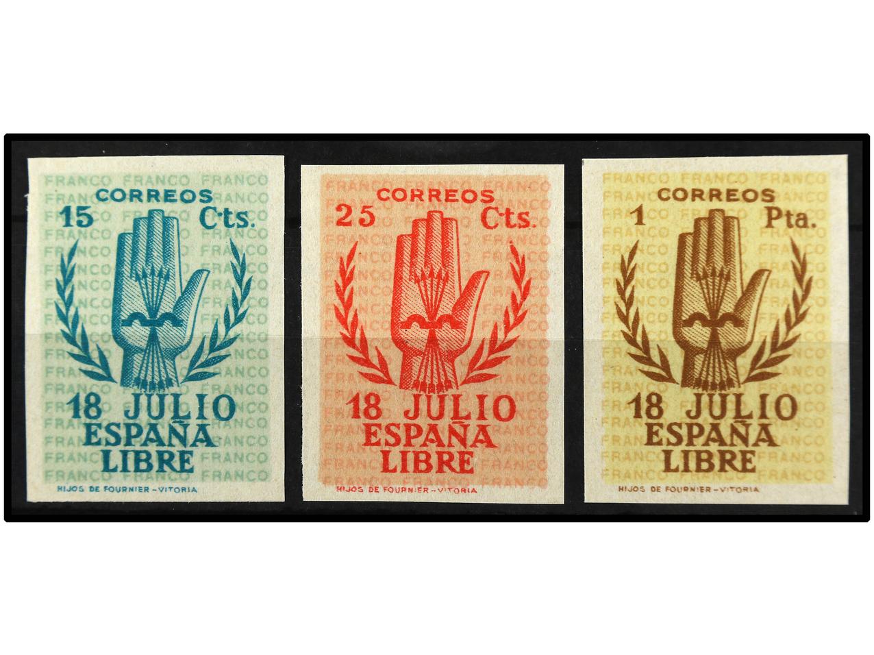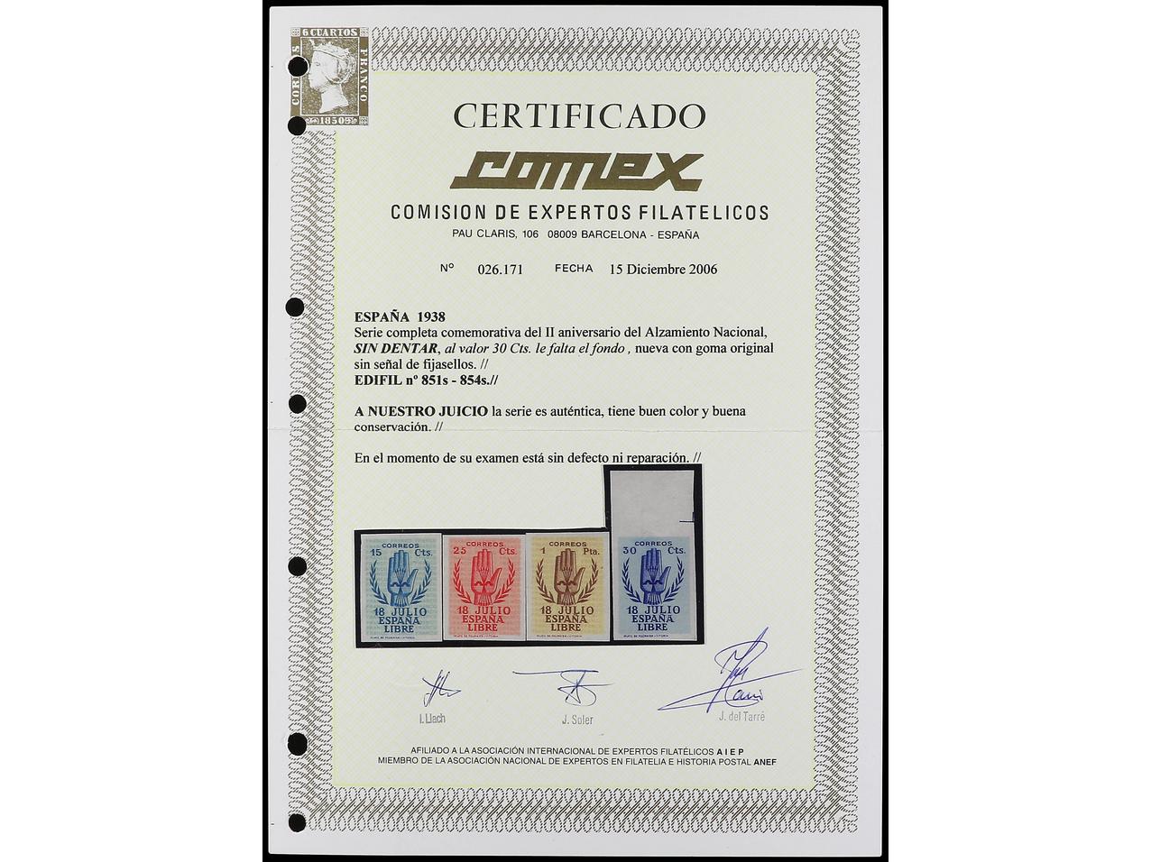 ESPAÑA. 15 cts., 25 cts. y 1 pta. 3 valores SIN DENTAR. LUJO. Cert. COMEX. Ed.851s, 852s y 854s. Cat. 990€. (Image1) (Image2)