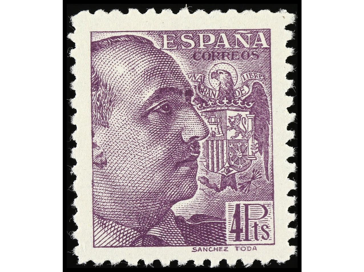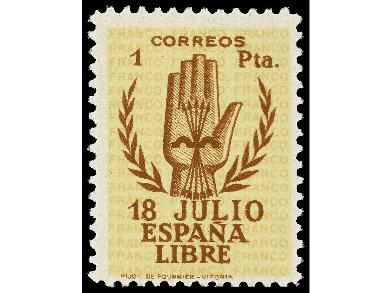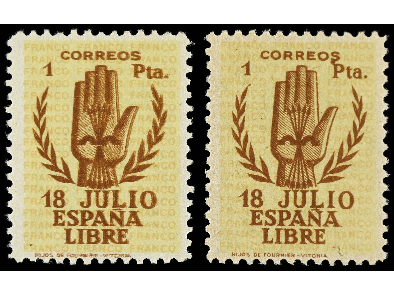 ESPAÑA. 1 pta. castaño sobre amarillo. Dos ejemplares ´S´ de ´CORREOS´ y ´P´ de ´Pta.´ unidas y DOBLE IMPRESIÓN. Ed.854ta y 854ed. Cat. +293€.