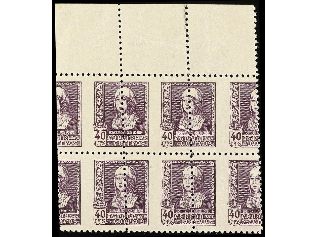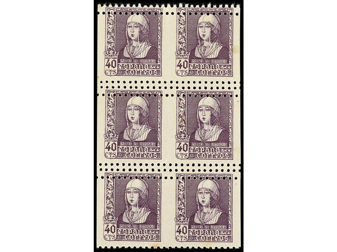 ESPAÑA. 40 cts. violeta. Bloque de seis, una hilera con doble dentado horizontal y dos hileras con triple dentado horizontal. Ed.858. (Image1)