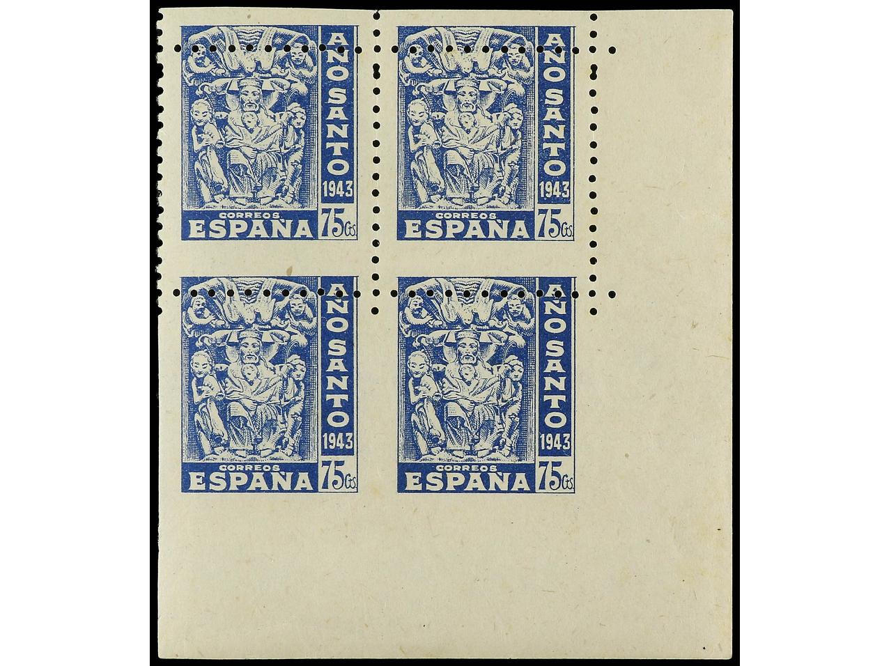 ESPAÑA. 75 cts. azul. Bloque de 4. DENTADO DESPLAZADO quedando los sellos inferiores SIN DENTAR el margen inferior y parcialmente los laterales. RARÍSIMA variedad de la que pueden existir máximo 10 ejemplares. Inapreciables sombras del