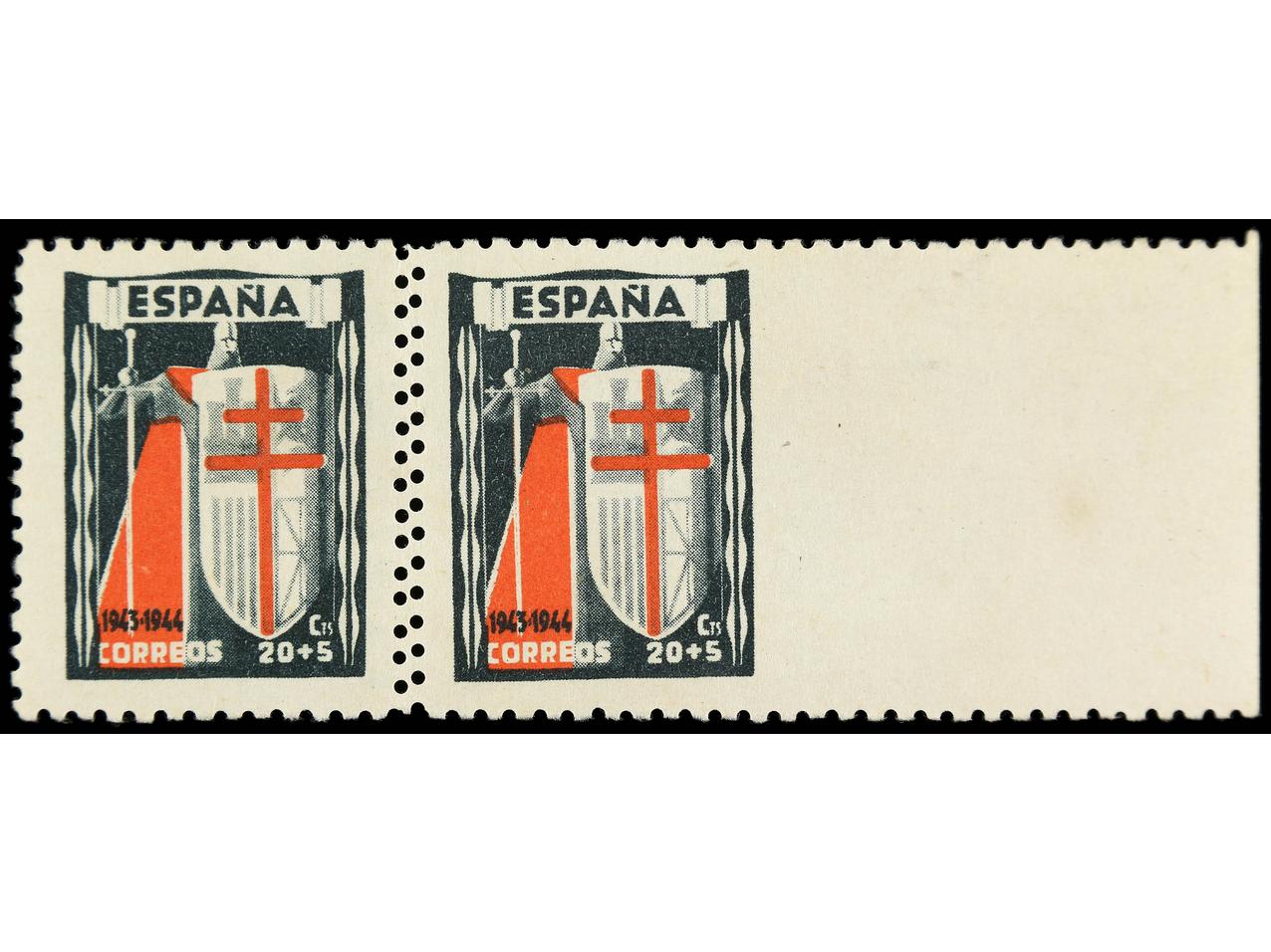 ESPAÑA. 20 + 5 cts. verde. Pareja SIN DENTAR MARGEN DERECHO y DOBLE DENTADO entre los sellos. RARO. Ed.971smd. (Image1)