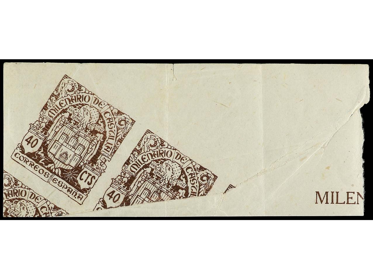 ESPAÑA. 40 cts. castaño SIN DENTAR. Ejemplar impreso en el borde del pliego quedando otros ejemplares con una impresión parcial. PIEZA EXCEPCIONAL, este sello sin dentar es el ÚNICO CONOCIDO hasta la fecha. Algunas dobleces propias de la