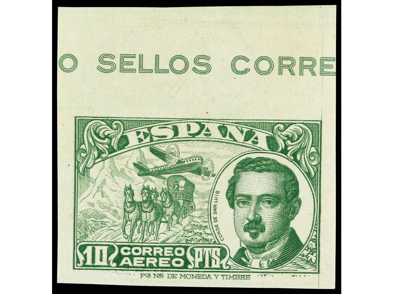 ESPAÑA. 10 pts. verde amarillo. SIN DENTAR. Cabecera de hoja. MUY RARO y de LUJO. Ed.990s. (Image1) (Image2)