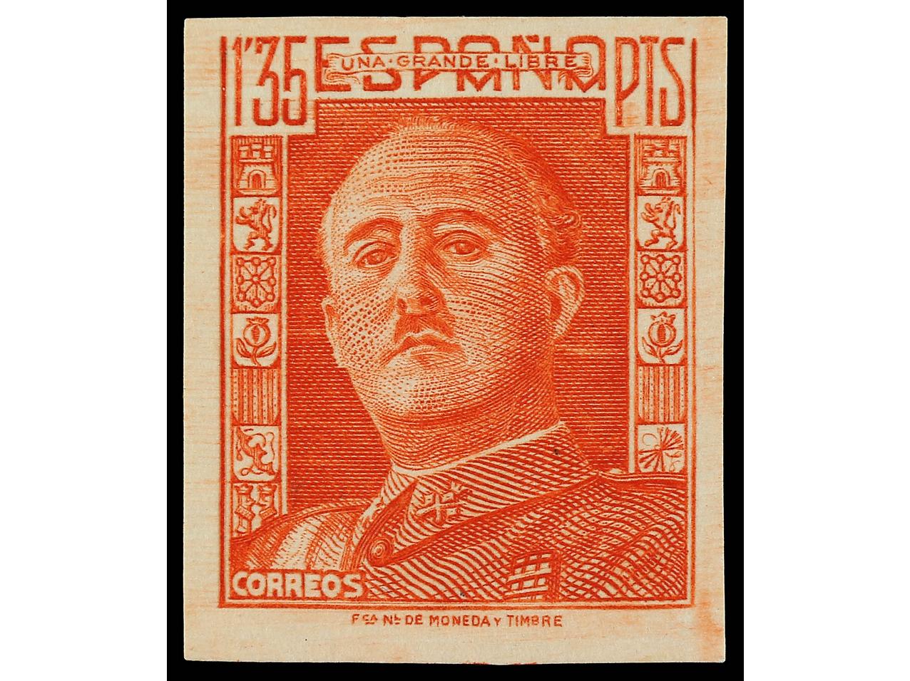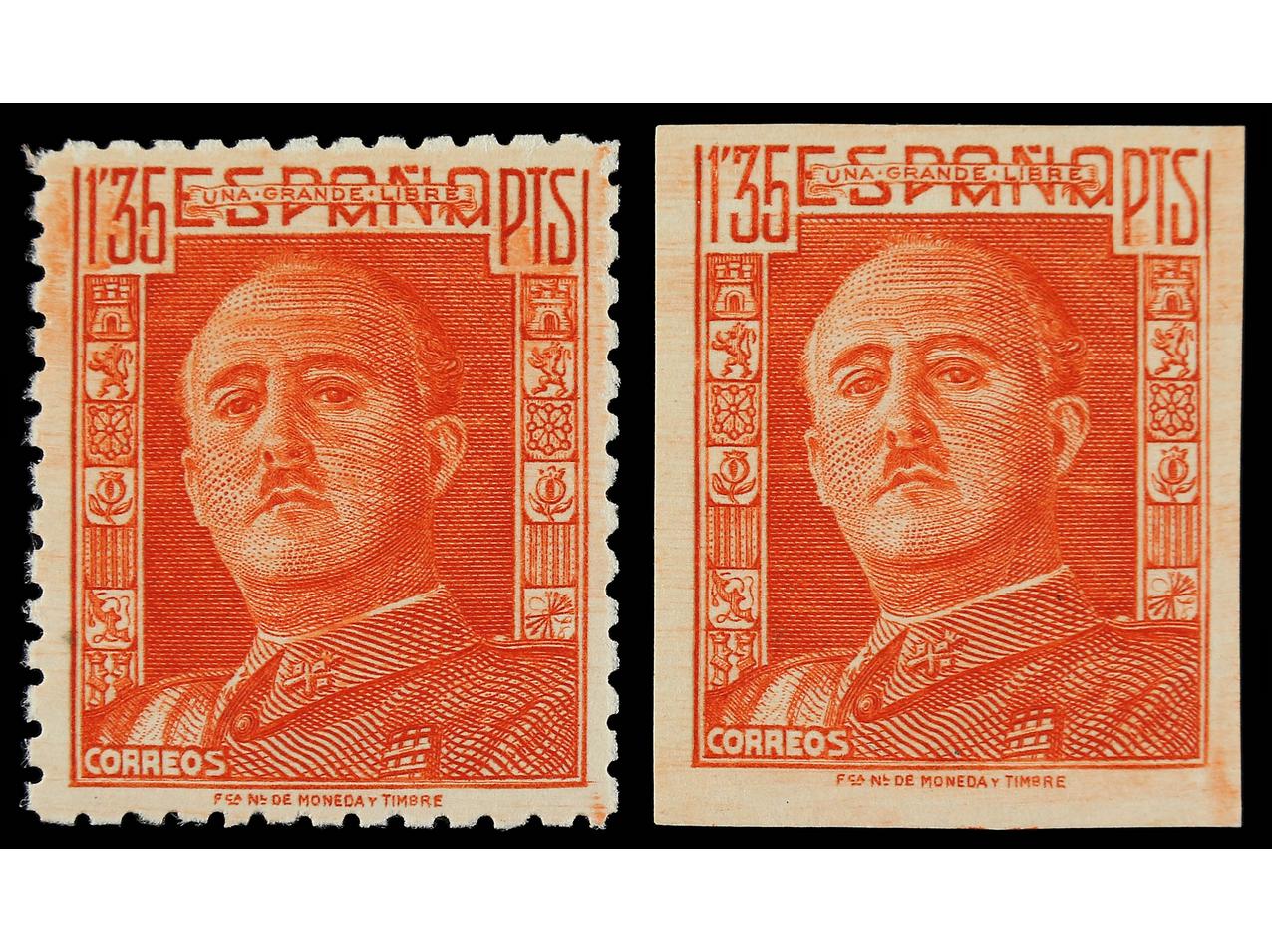 ESPAÑA. 1,35 pts. bermellón. Dentado y sin dentar (este sin goma). ENSAYOS DE COLOR. (Image1) (Image2)