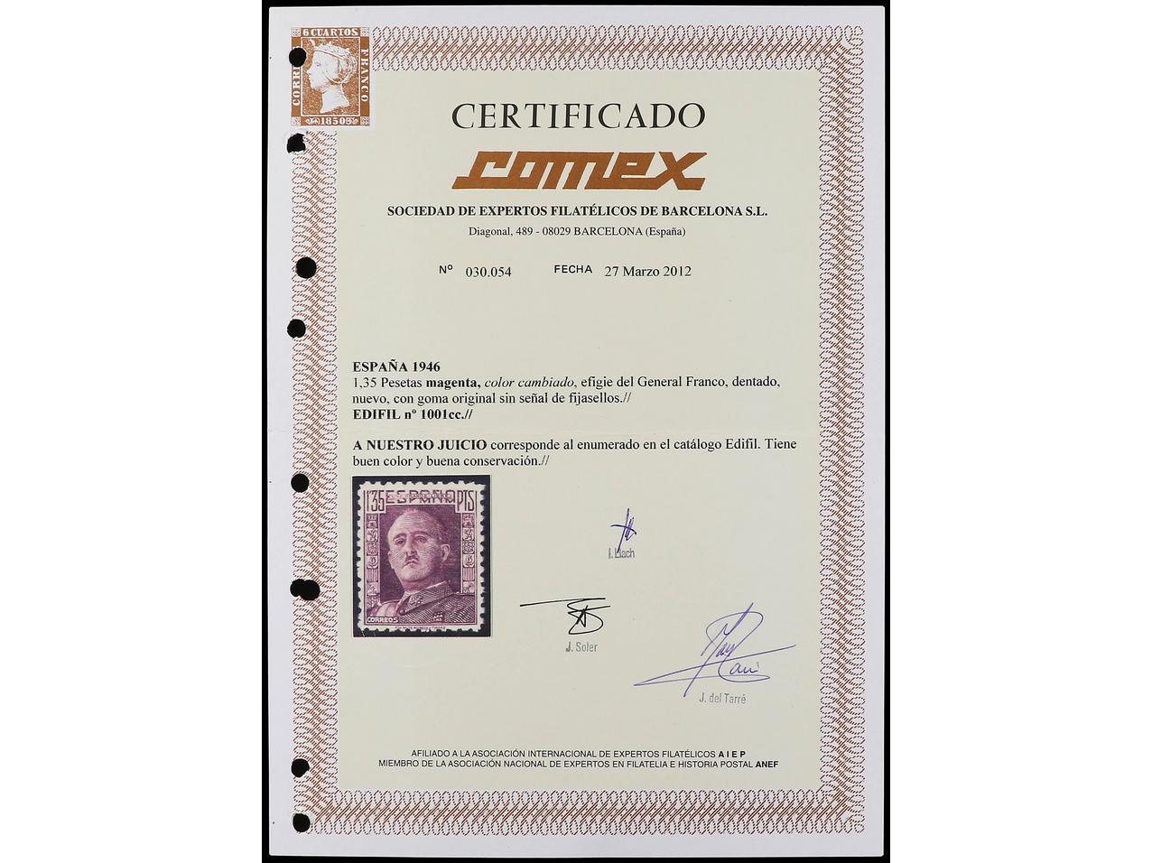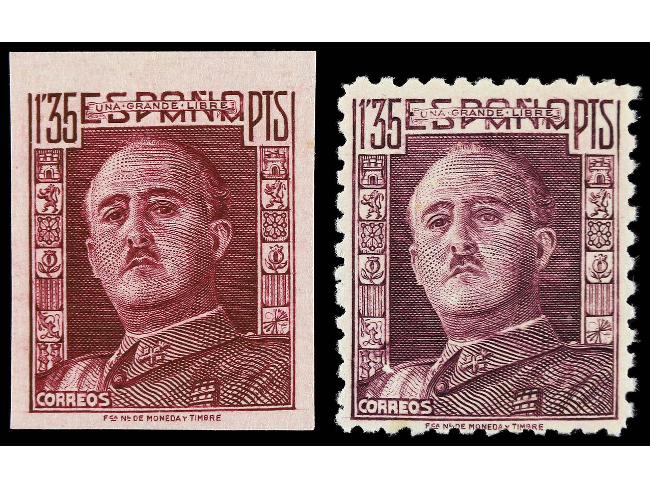 ESPAÑA. 1,35 pts. magenta, dentado (cert. COMEX) y sin dentar. COLORES CAMBIADOS. Ed.1001cc y 1001ccs. (Image1) (Image2)