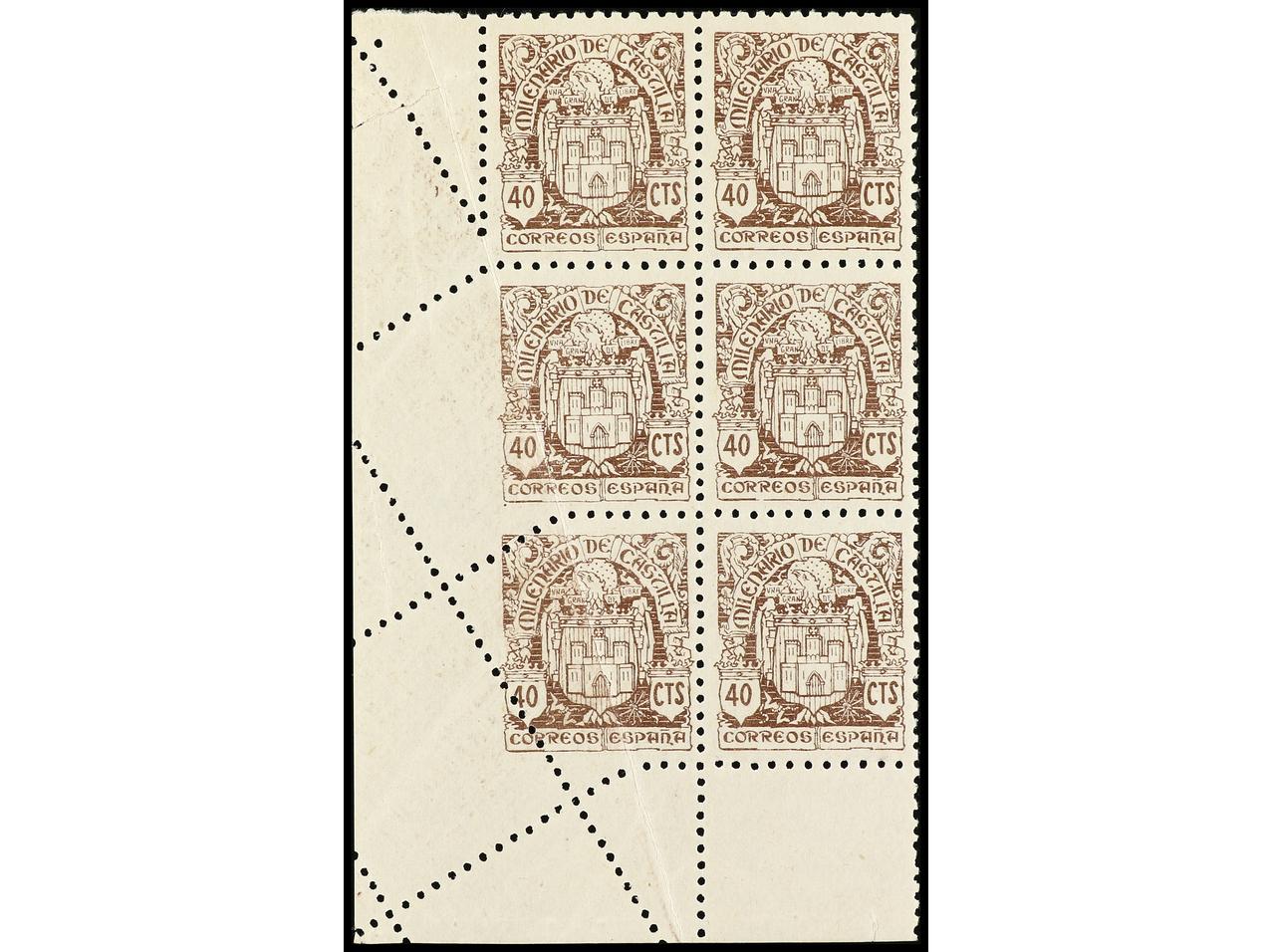 ESPAÑA. 40 cts. castaño. Bloque de seis. Variedad de dentado producida por pliegue del papel, quedando un sello SIN DENTAR MARGEN DERECHO. ÚNICO CONOCIDO. Ed.975 (6). (Image1)