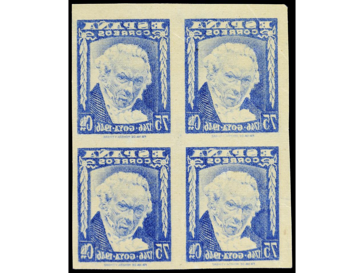 ESPAÑA. 75 cts. azul. Bloque de 4 CALCADO AL DORSO. No reseñado. Ed.1007ics (4). (Image1)
