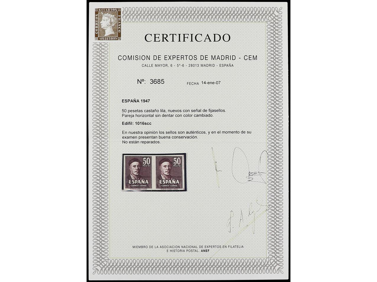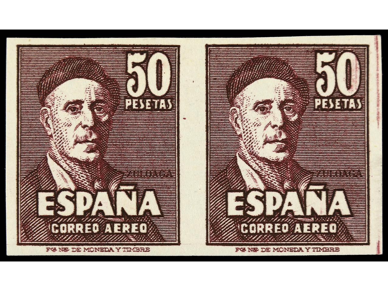 ESPAÑA. 50 pts. castaño lila. Pareja SIN DENTAR COLOR CAMBIADO. MAGNÍFICA y RARA. Cert. CEM. Ed.1016scc. Cat. 1.630€. (Image1) (Image2)