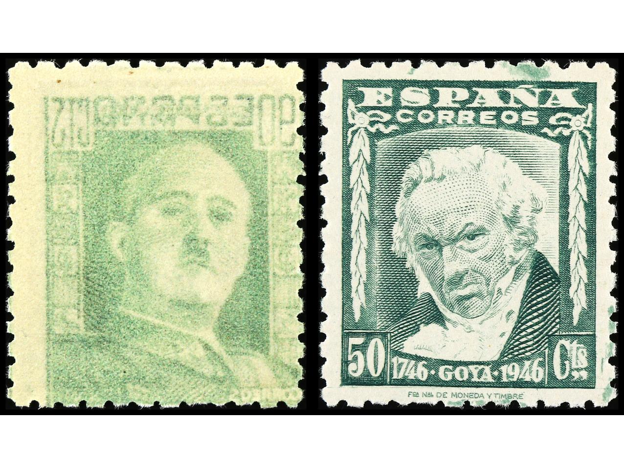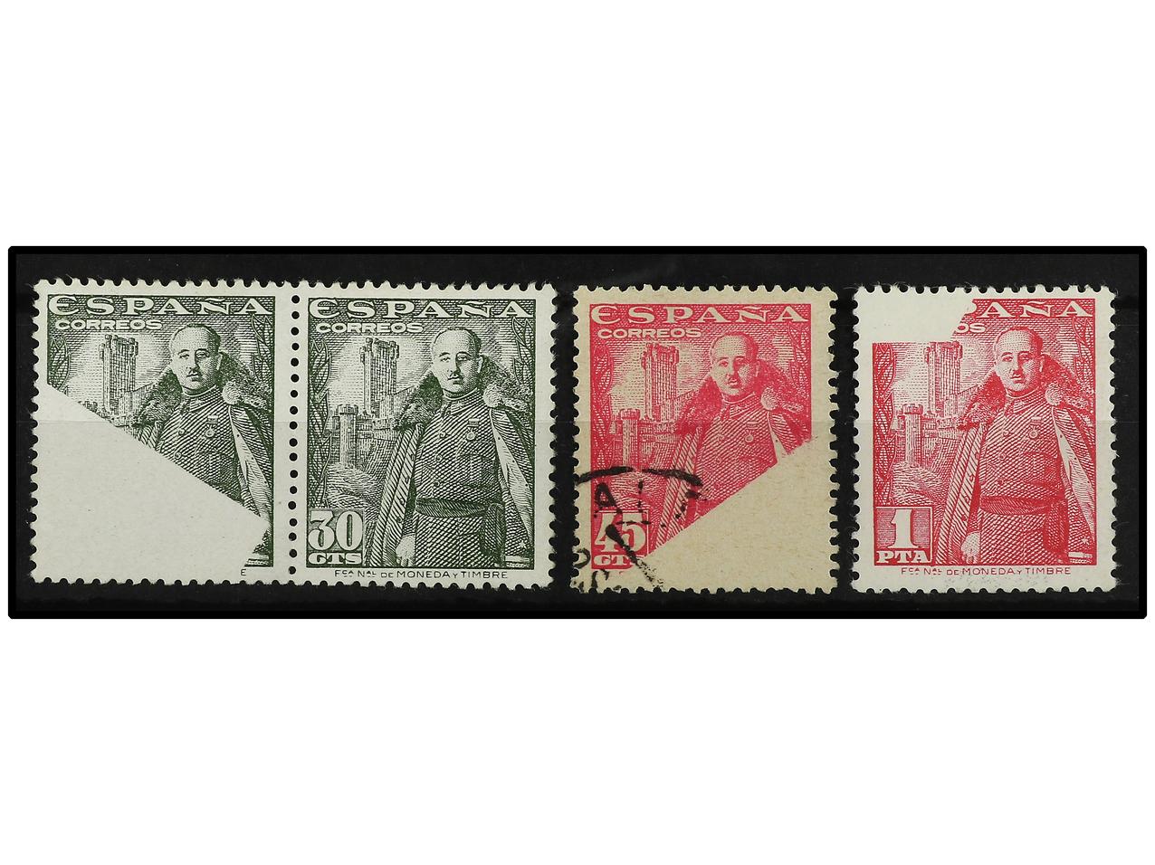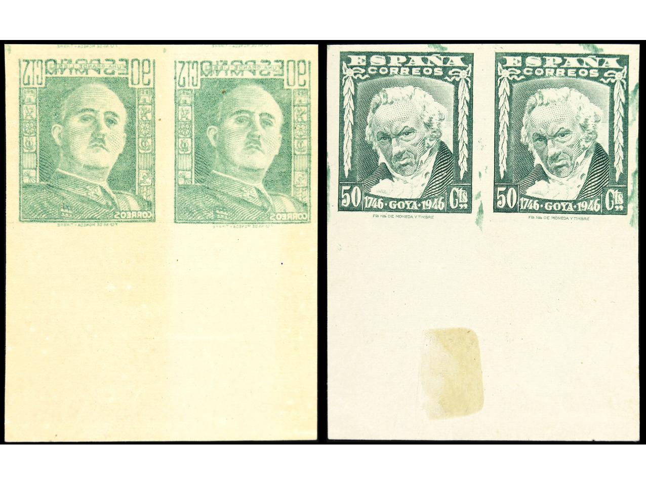 ESPAÑA. 50 cts. verde SIN DENTAR. Pareja, al dorso sello de 50 cts. de Franco (Ed. 1001). No reseñado sin dentar. RARO. Cert. CEM del bloque de cuatro de donde procede. Ed.1006ica. (Image1) (Image2)