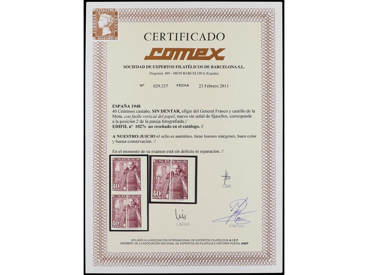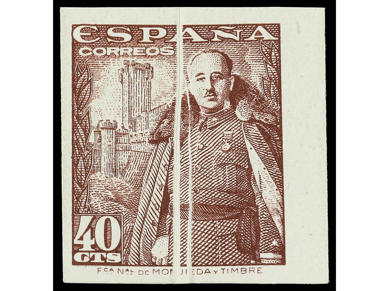 ESPAÑA. 40 cts. castaño. SIN DENTAR. Fuelle vertical. Este ejemplar pertenece a una pareja, según consta en el cert. COMEX. No reseñado. RARÍSIMO. Ed.1027s.