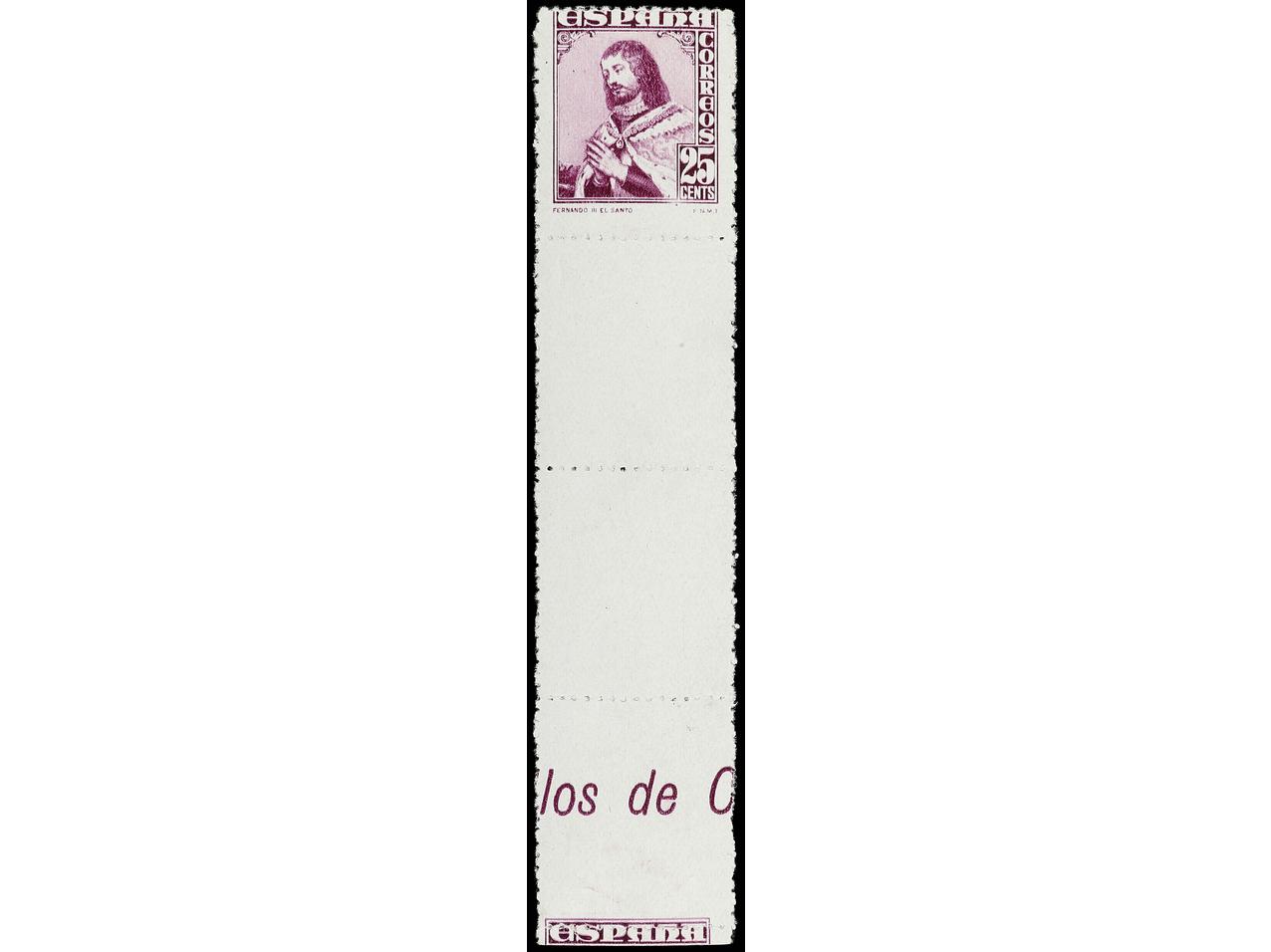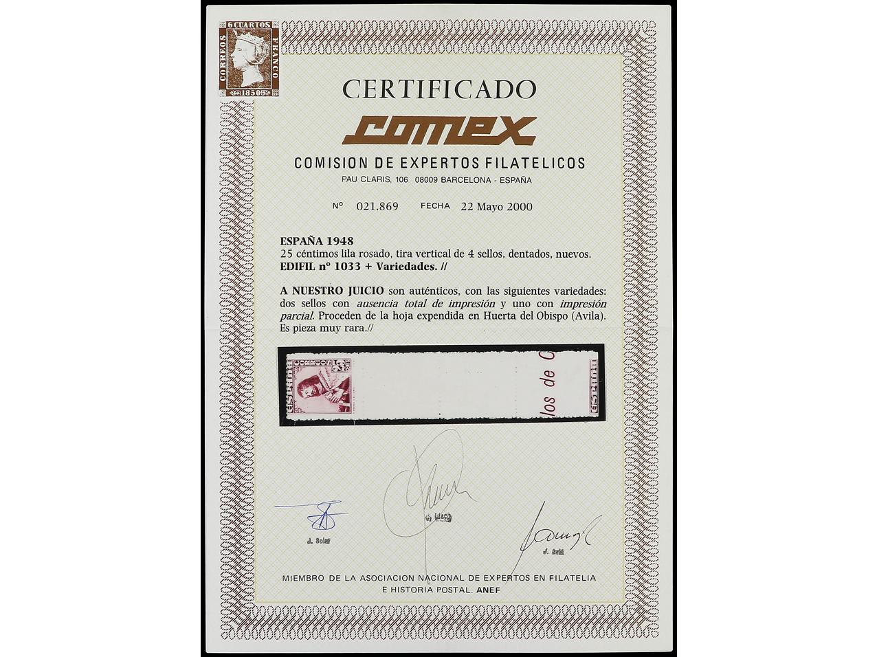 ESPAÑA. 25 cts. lila rosado. Tira vertical de 4, 2 sellos con AUSENCIA TOTAL DE IMPRESIÓN y 1 con IMPRESIÓN PARCIAL. Cert. COMEX. Ed.1033 (4).