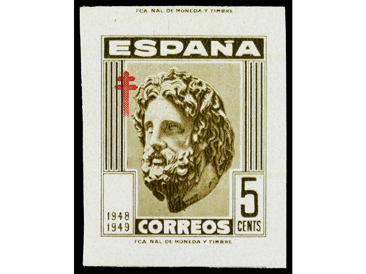 ESPAÑA. 5 cts. sepia. SIN DENTAR y con la Cruz de Lorena desplazada hacia arriba. MAGNÍFICA PIEZA. Muy pocas conocidas. Leves pliegues habituales sin importancia. Ed.1040s. (Image1)