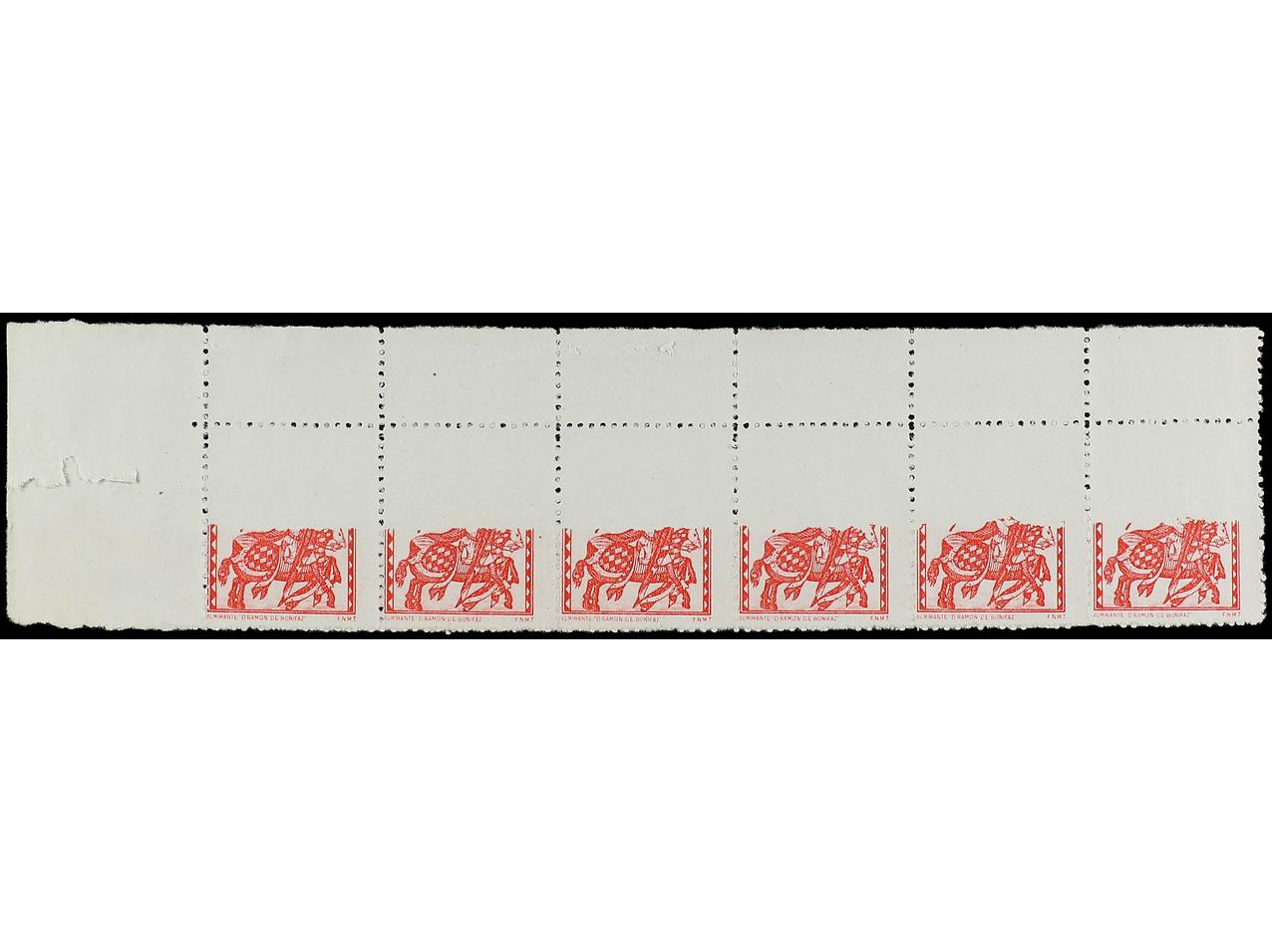 ESPAÑA. 30 cts. rojo. Espectacular bloque de 13, cabecera de hoja con los 6 sellos inferiores PAPEL EMPALMADO. RARO. Ed.1034x (6). Cat. +270€.
