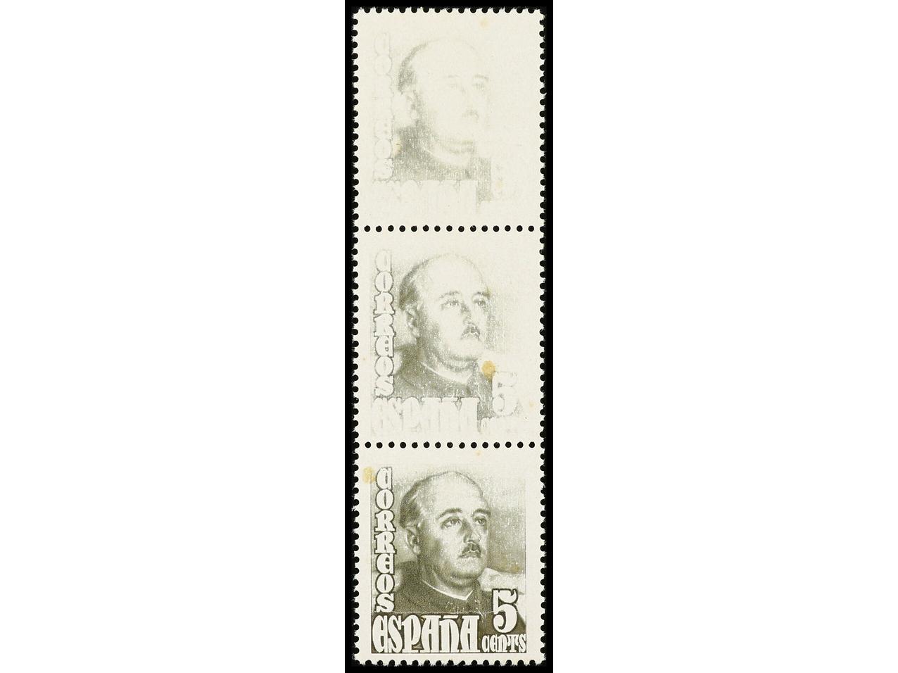 ESPAÑA. 5 cts. oliva. Tira vertical de tres, sellos superiores impresión desvaida, manchas del tiempo. Ed.1020. (Image1)