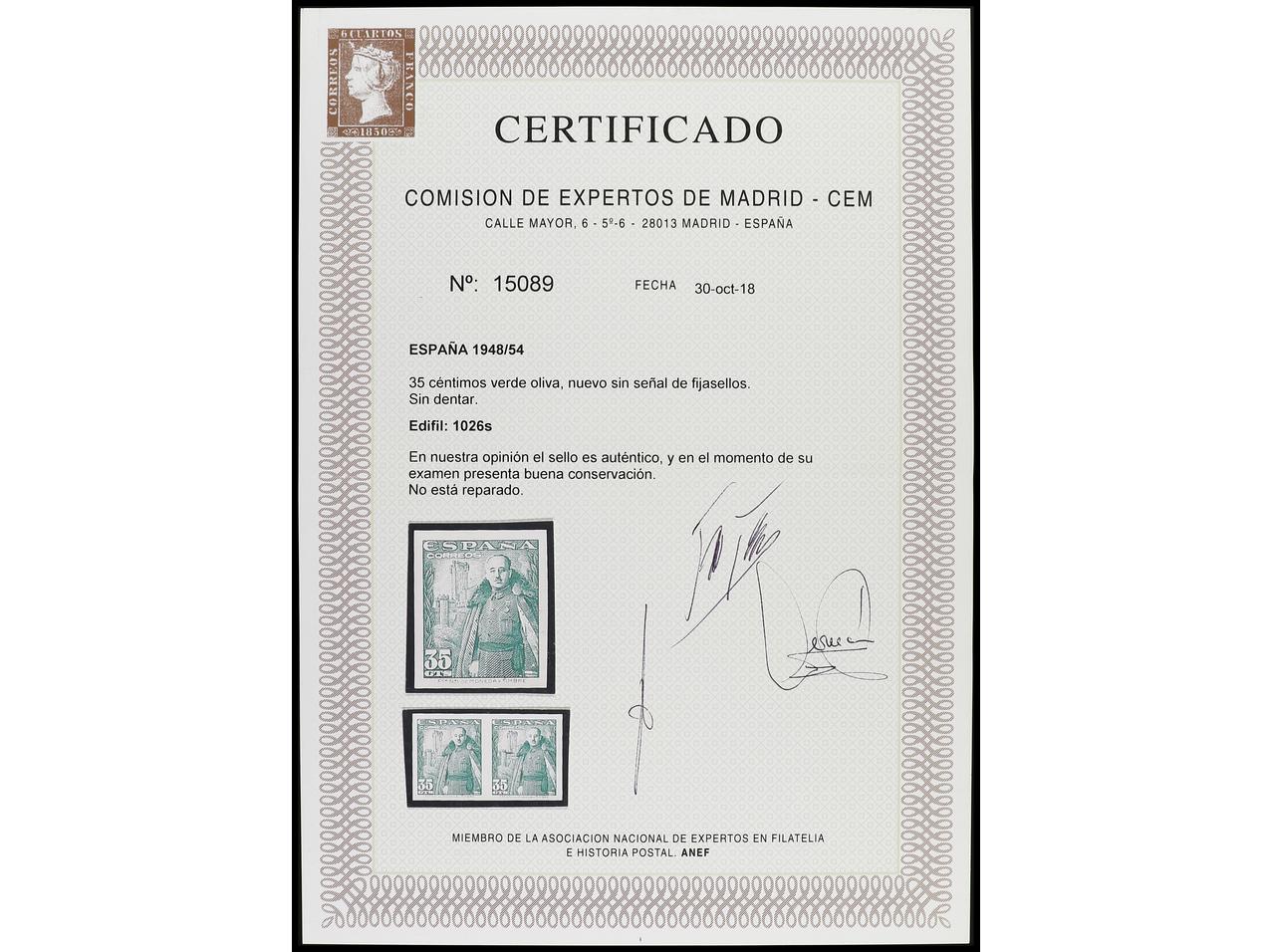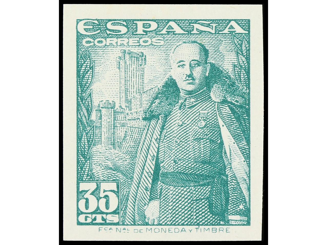 ESPAÑA. 35 cts. verde SIN DENTAR. RARO y de LUJO. Cert. CEM. Ed.1026s. Cat. 440€. (Image1) (Image2)
