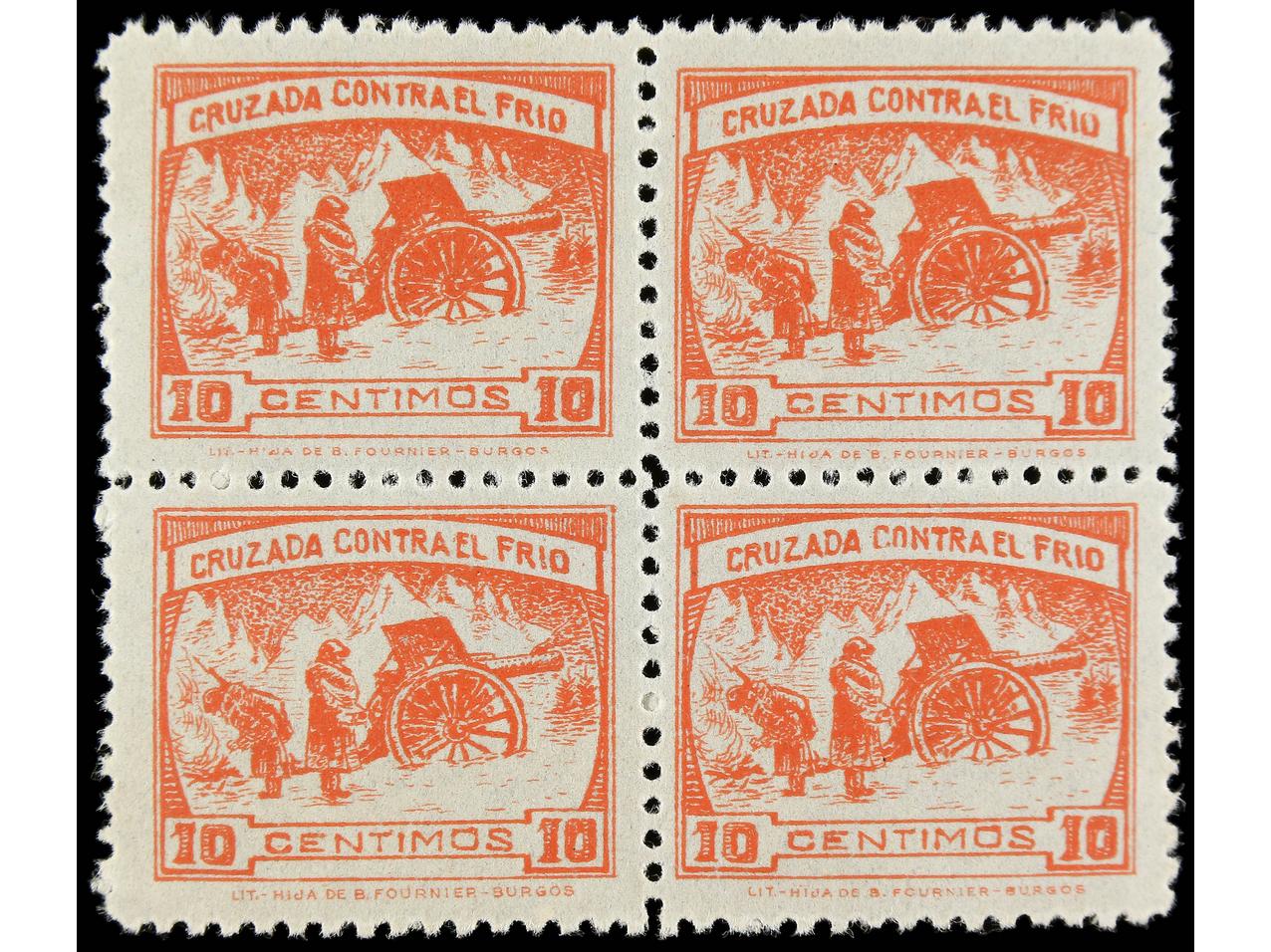 ESPAÑA: FISCALES. 1877. PÓLIZAS. ENSAYOS sobre papel cartulina procedentes de la Hoja Muestra, serie completa en dos bloques de cuatro y cuatro parejas, alguna mancha sin importancia. Al. 183/93. (Image1) (Image2)