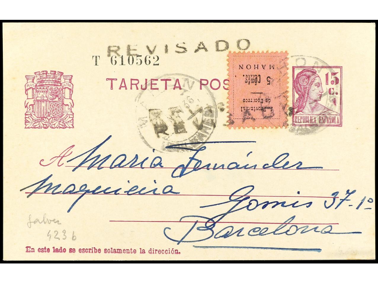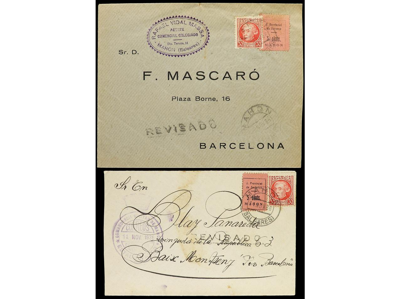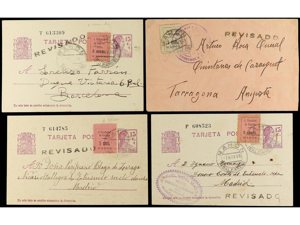 ESPAÑA GUERRA CIVIL. 1936. 5 cartas y 3 enteros postales cirucladas con viñetas de MAHON de la Junta Provincial de Socorros y Pro Milicias Antifascistas.