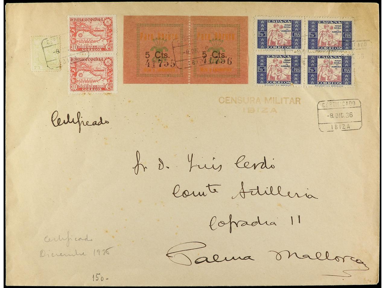 ESPAÑA GUERRA CIVIL. 1936. IBIZA a PALMA. Circulada con dos viñetas de 5 cts. de Pro-Paro, Ibiza y Formentera. Al dorso llegada. Raras en carta.