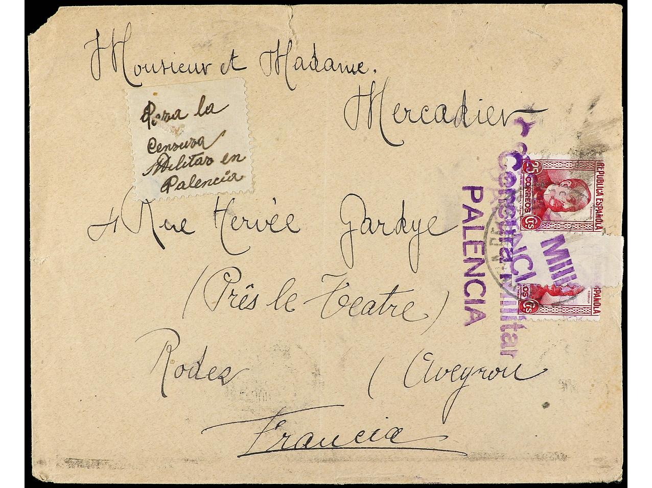 ESPAÑA GUERRA CIVIL. 1937. ZONA REPUBLICANA. PALENCIA a FRANCIA, 25 c. (2), marca de censura y manuscrito ´Para la Censura Militar en Palencia´. CURIOSO.