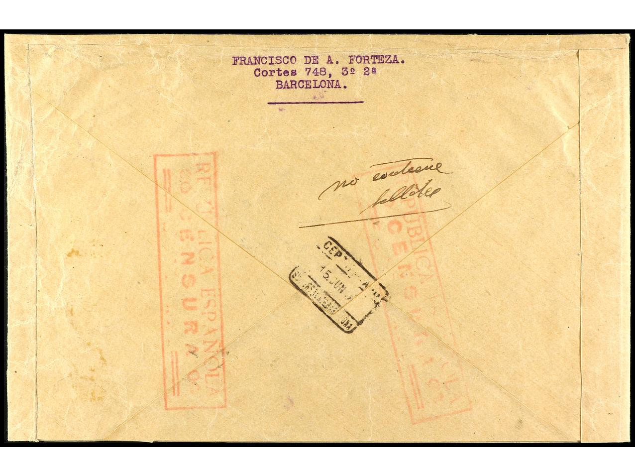 ESPAÑA GUERRA CIVIL. 1937. BARCELONA a BELGICA. Carta certificada con precioso franqueo y viñeta de 5 cts. del Concell de Sanitat de guerra. RARA circulada.