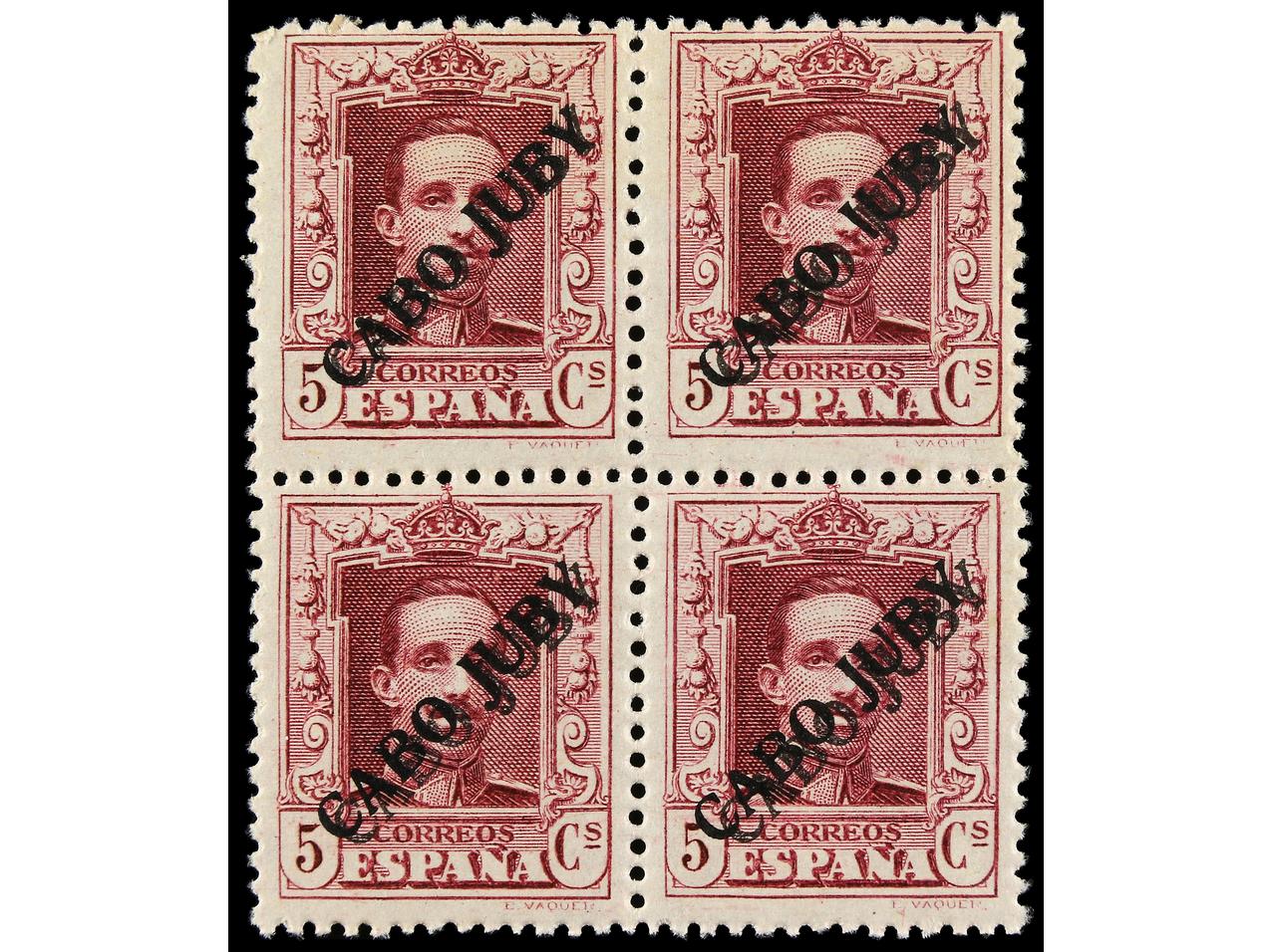 COLONIAS ESPAÑOLAS: CABO JUBY. 5 c. lila, DOBLE HABILITACIÓN. Bloque de cuatro. Ed.23hh. (Image1)
