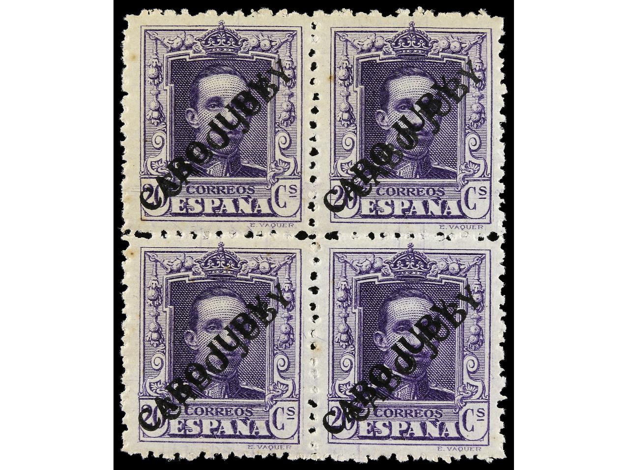 COLONIAS ESPAÑOLAS: CABO JUBY. 20 c. violeta, DOBLE HABILITACIÓN. Bloque de cuatro. Ed.25hh. Cat. 700€. (Image1)