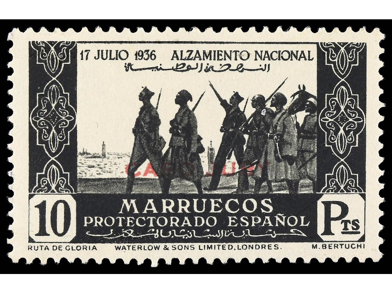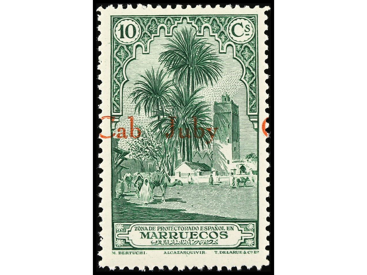 COLONIAS ESPAÑOLAS: CABO JUBY. 10 cts. verde. HABILITACIÓN EN COLOR DIFERENTE (ROJO) y ´CABO´ sin ´O´. MUY RARA variedad combinada. Ed.53hcchp. Cat. 900€.