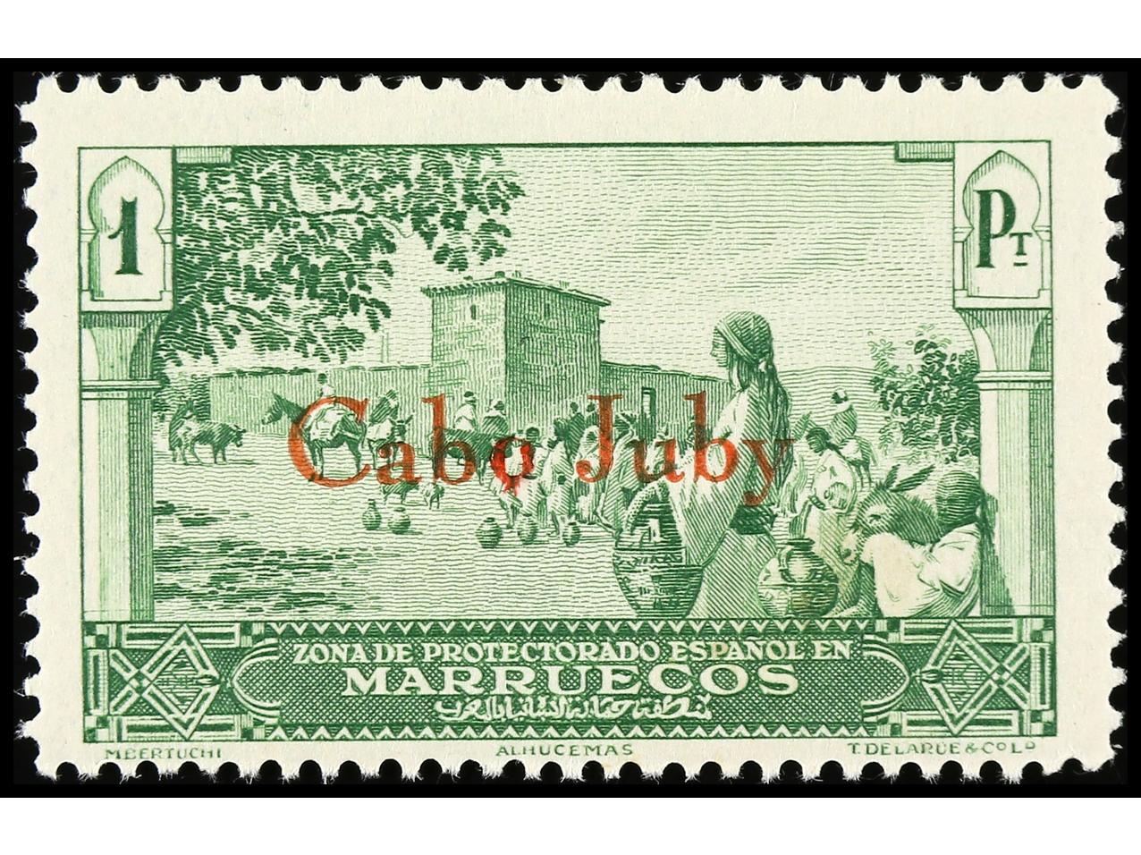 COLONIAS ESPAÑOLAS: CABO JUBY. 1 pta. verde HABILITACIÓN EN COLOR DIFERENTE (ROJO). Raro y de LUJO. Ed.56hcc. Cat. 450€. (Image1)