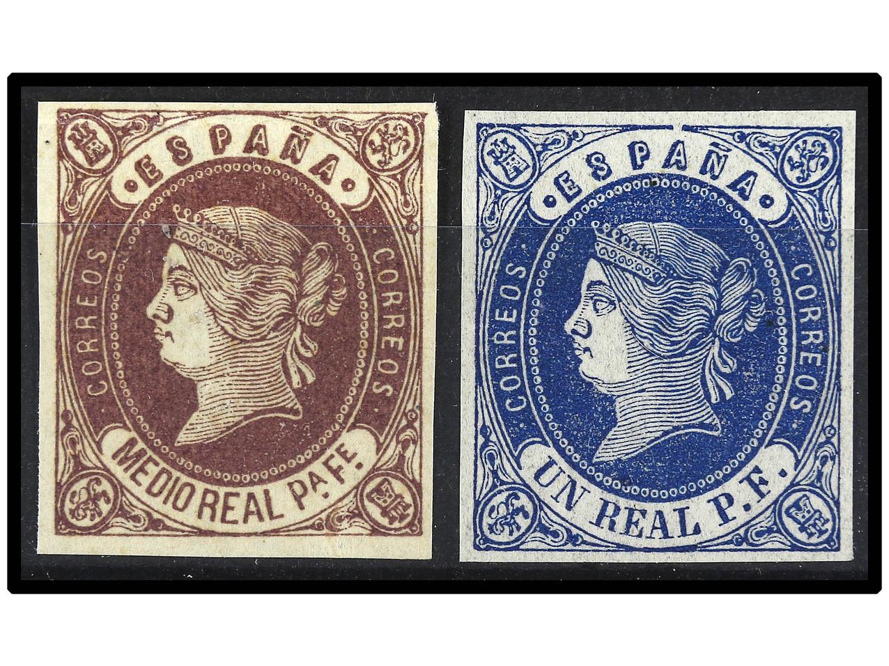 ESPAÑA. ENSAYOS DE COLOR para sellos de ultramar 1/2 real de peso fuerte castaño y 1 real de peso fuerte azul (Gálvez 260/61). (Image1) (Image2)