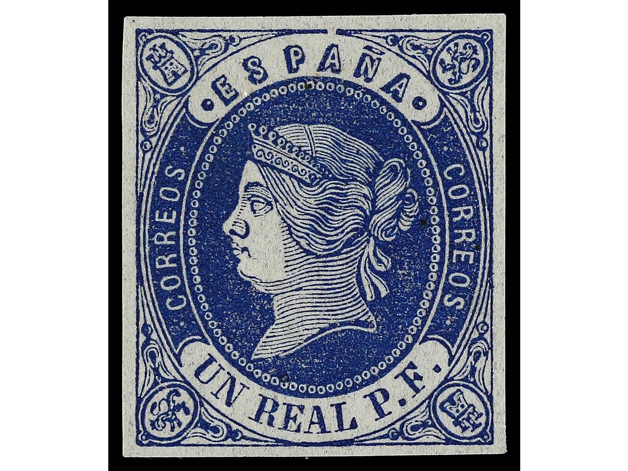 ESPAÑA. 1 real castaño s. amarillo, borde de hoja. LUJO. Ed.61. (Image1)