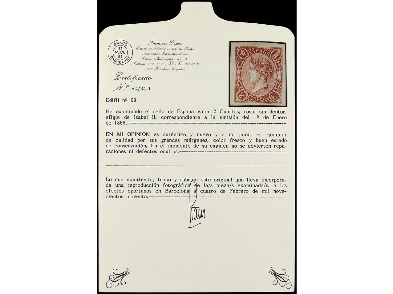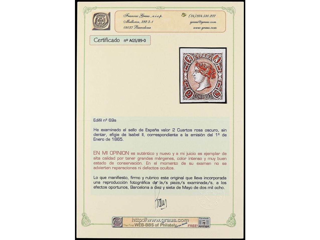 ESPAÑA. 2 cuartos carmín. PIEZA DE LUJO. Cert. GRAUS. Ed.69. Cat. 400€. (Image1) (Image2)
