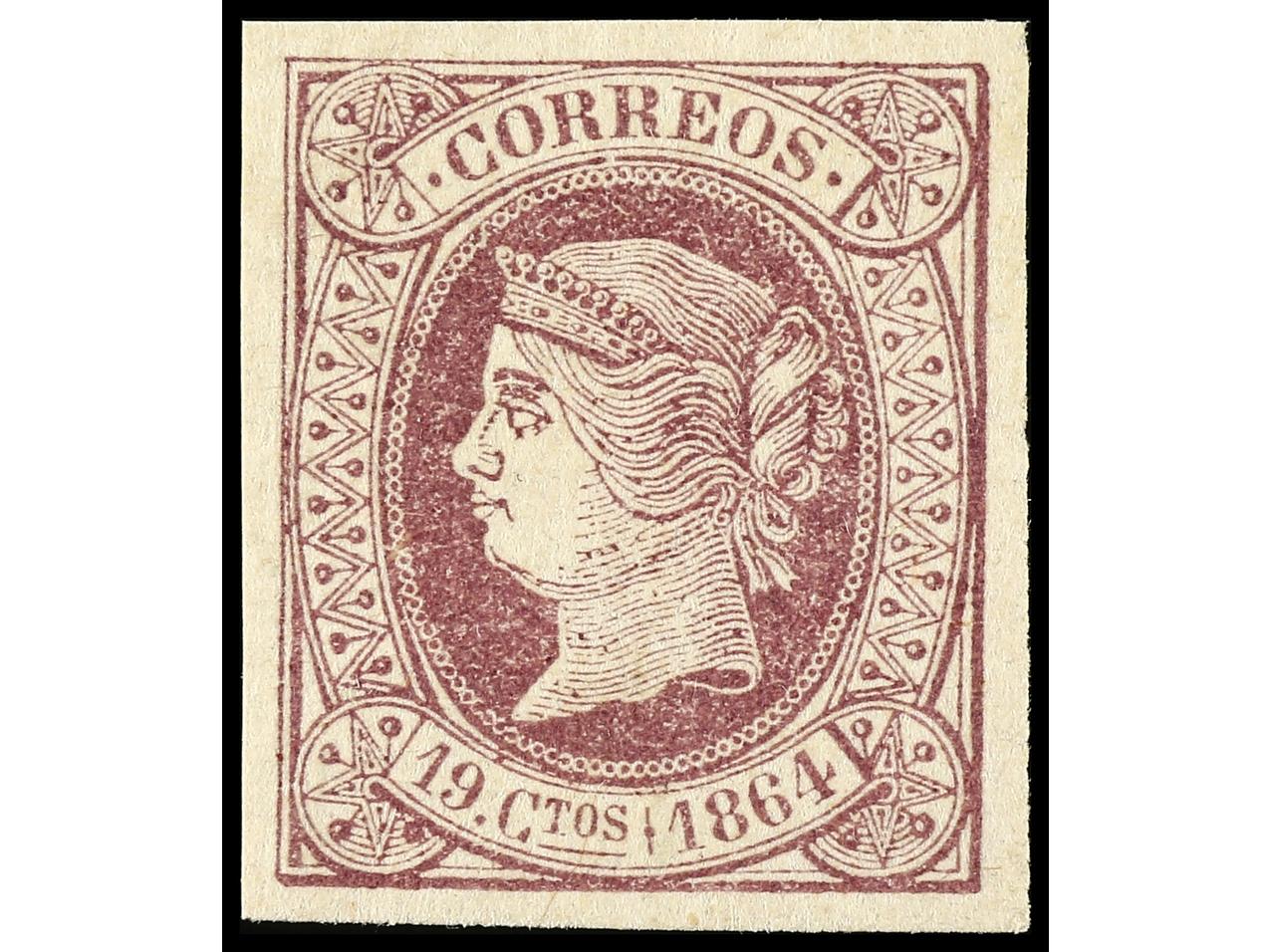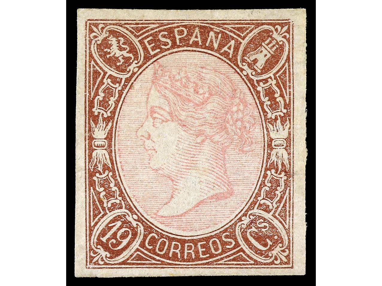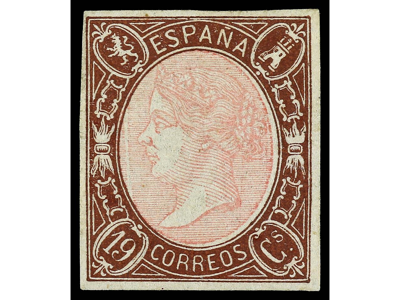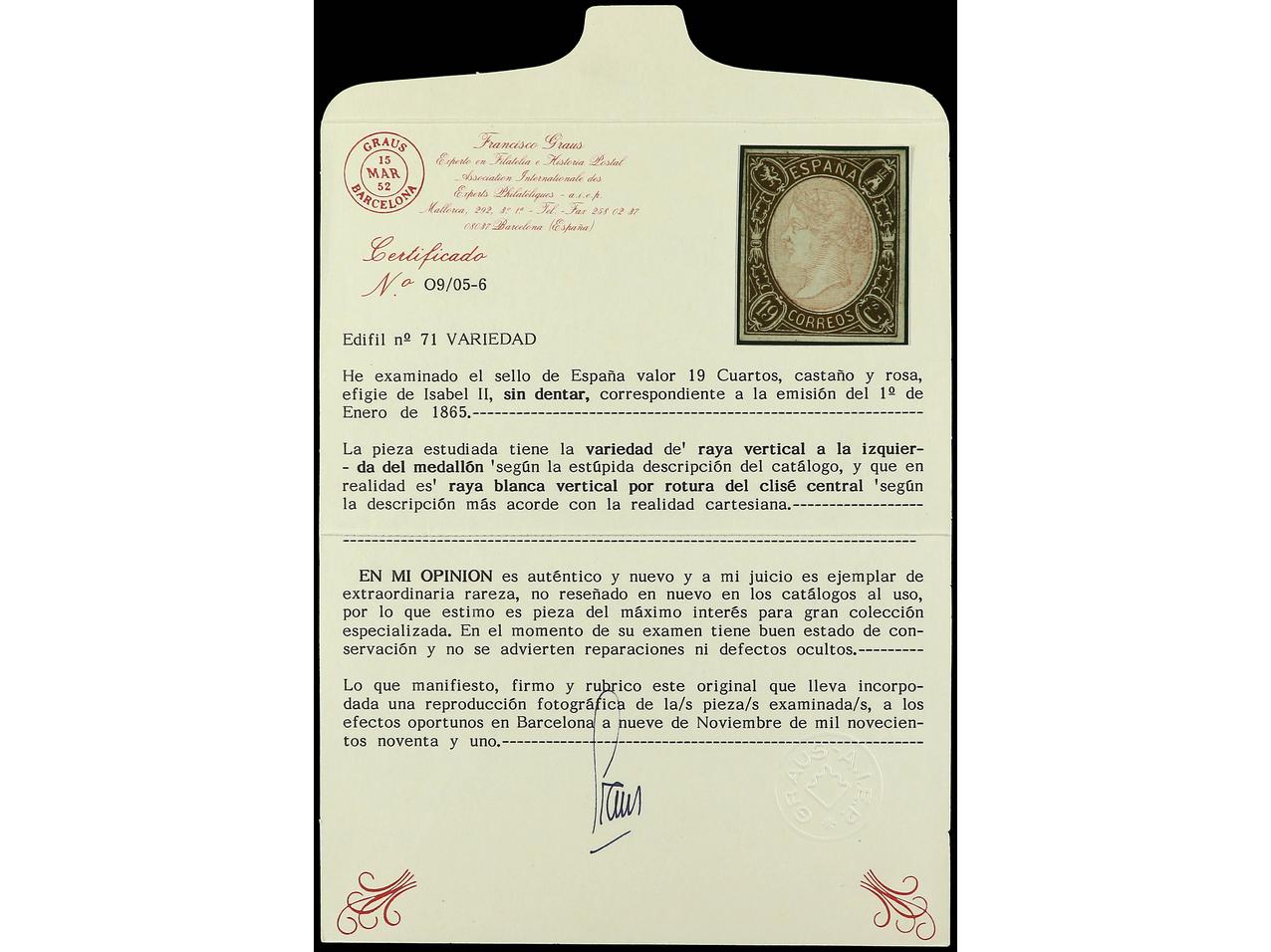 ESPAÑA. 19 cuartos castaño y rosa. Raya blanca vertical delante de la cara de la Reina. Sello rarísimo en nuevo, podría ser la única conocida así. Cert. GRAUS. Ed.71itb. Cat. 2.825€. (Image1) (Image2)