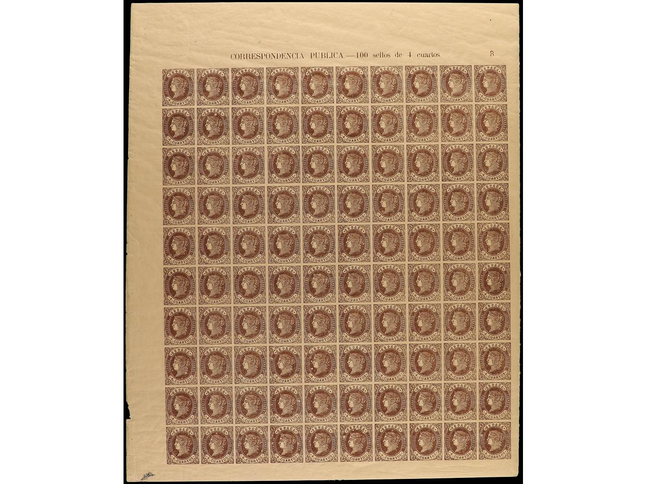 ESPAÑA. 4 cuartos castaño. Hoja completa de 100 ejemplares. Ed.58. (Image1)