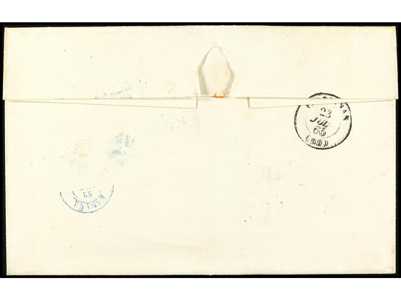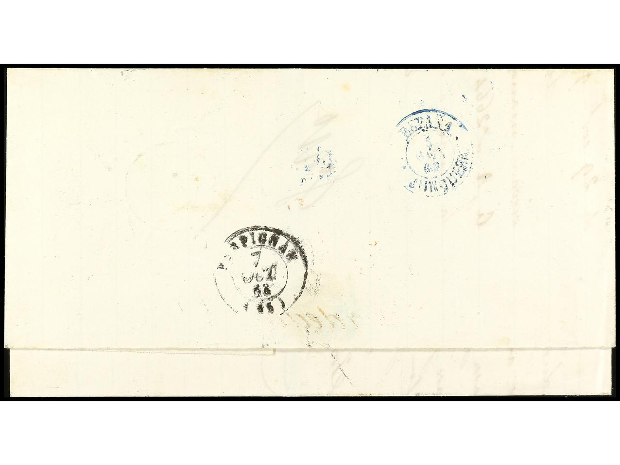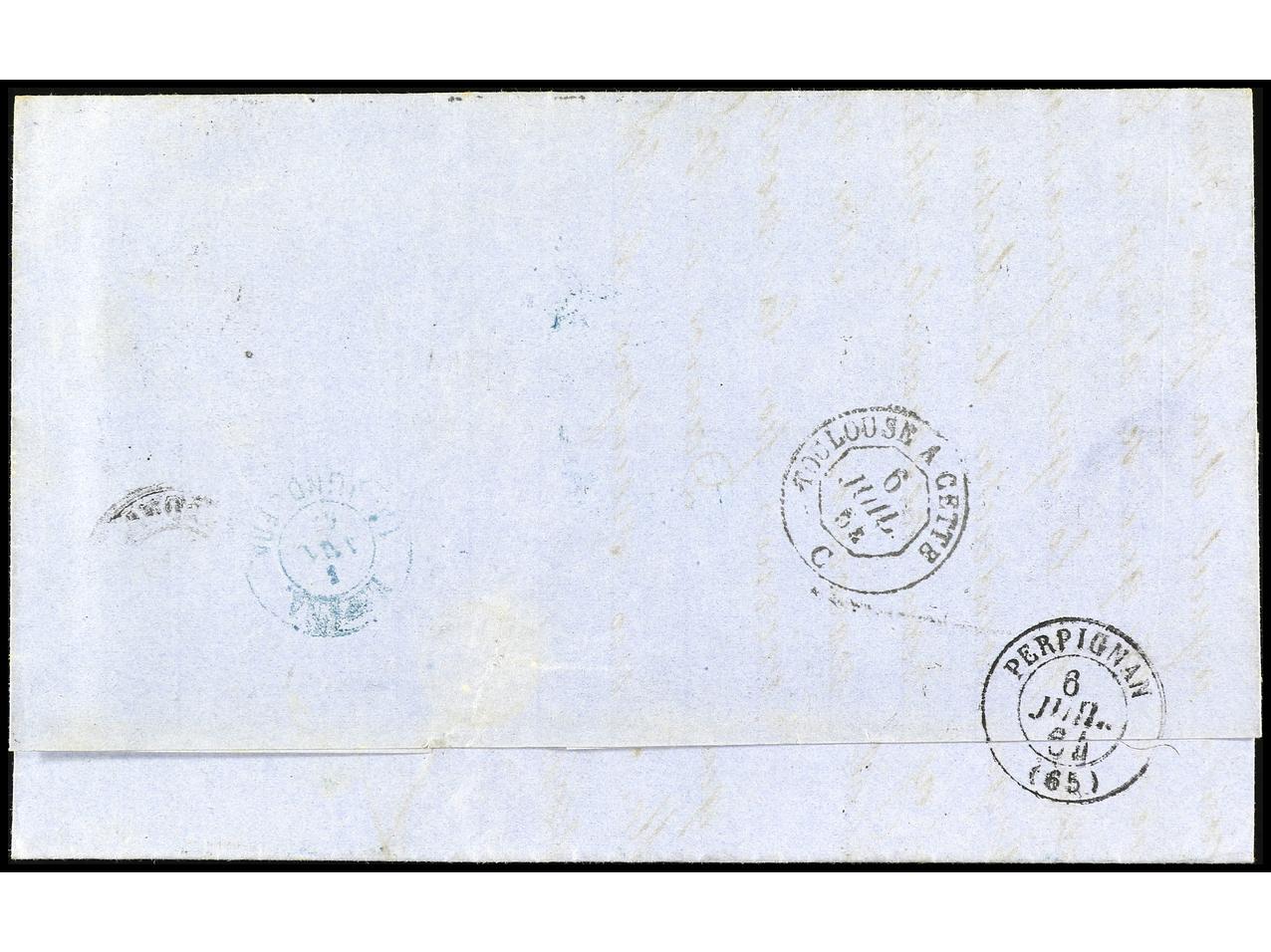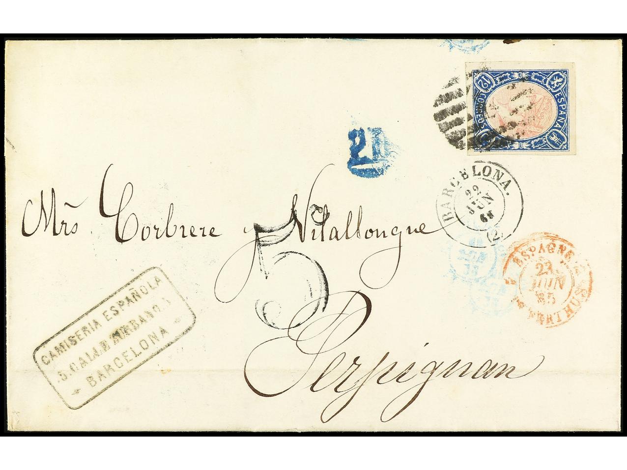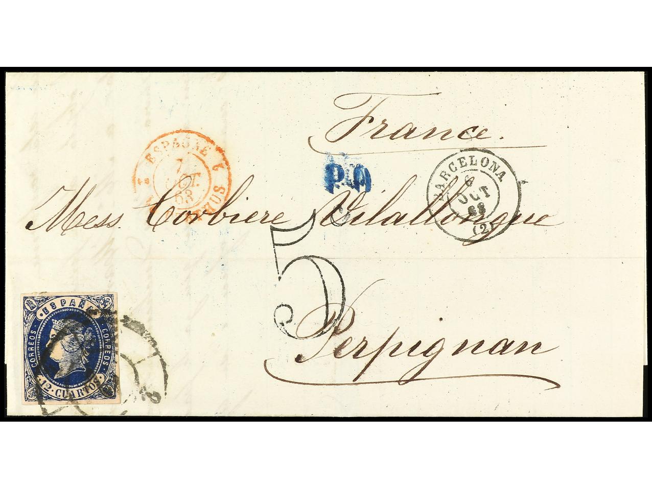 ESPAÑA. 1863. BARCELONA a FRANCIA. 12 cuartos azul s. rosa, FALSO POSTAL, tipo único. RARA. Ed.59F. (Image1) (Image2)