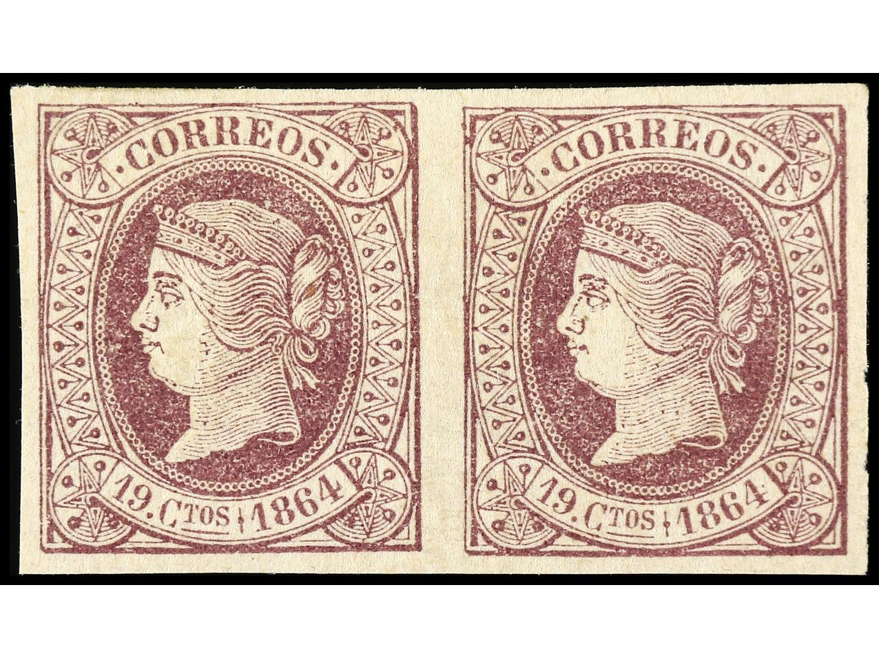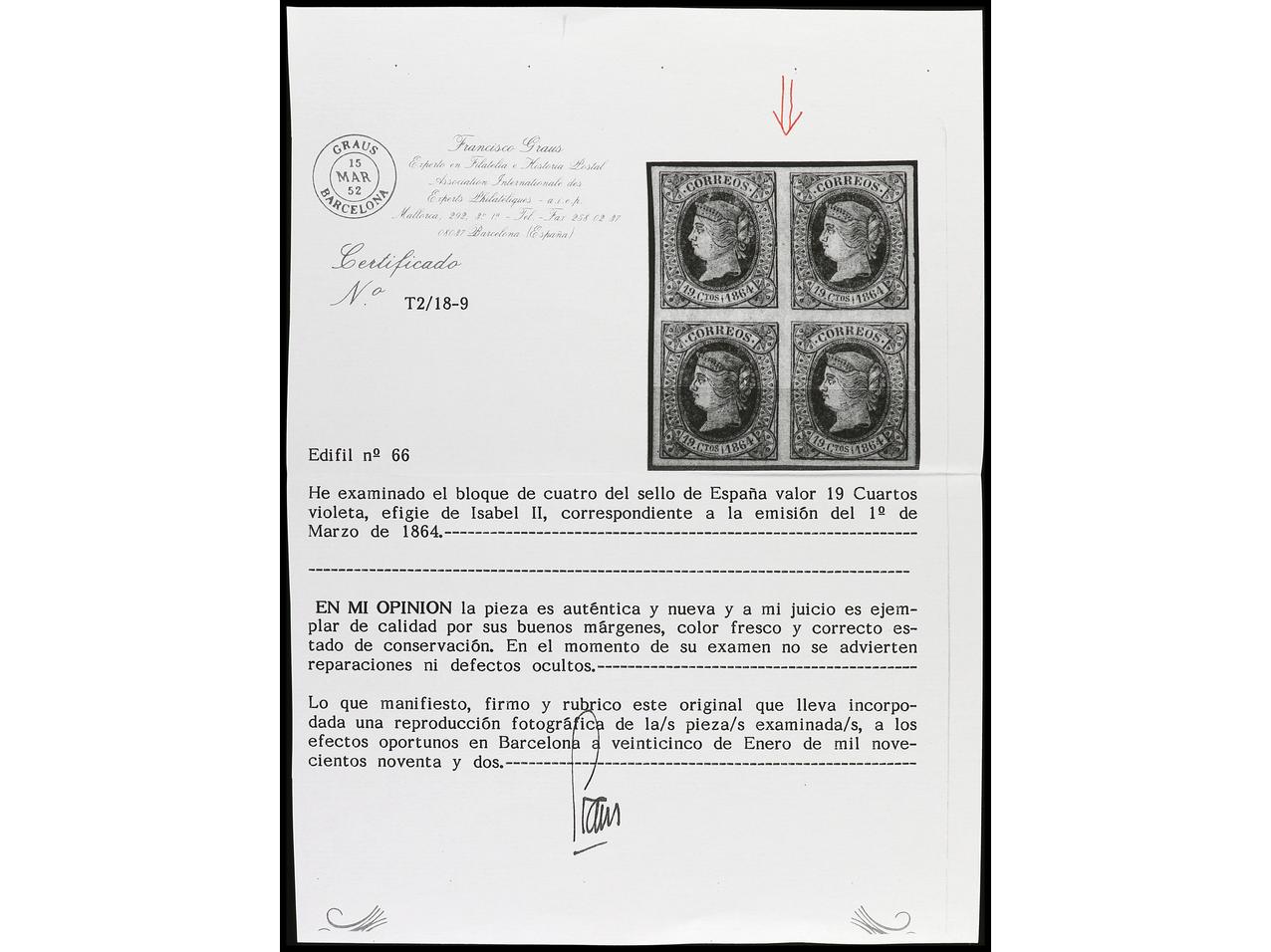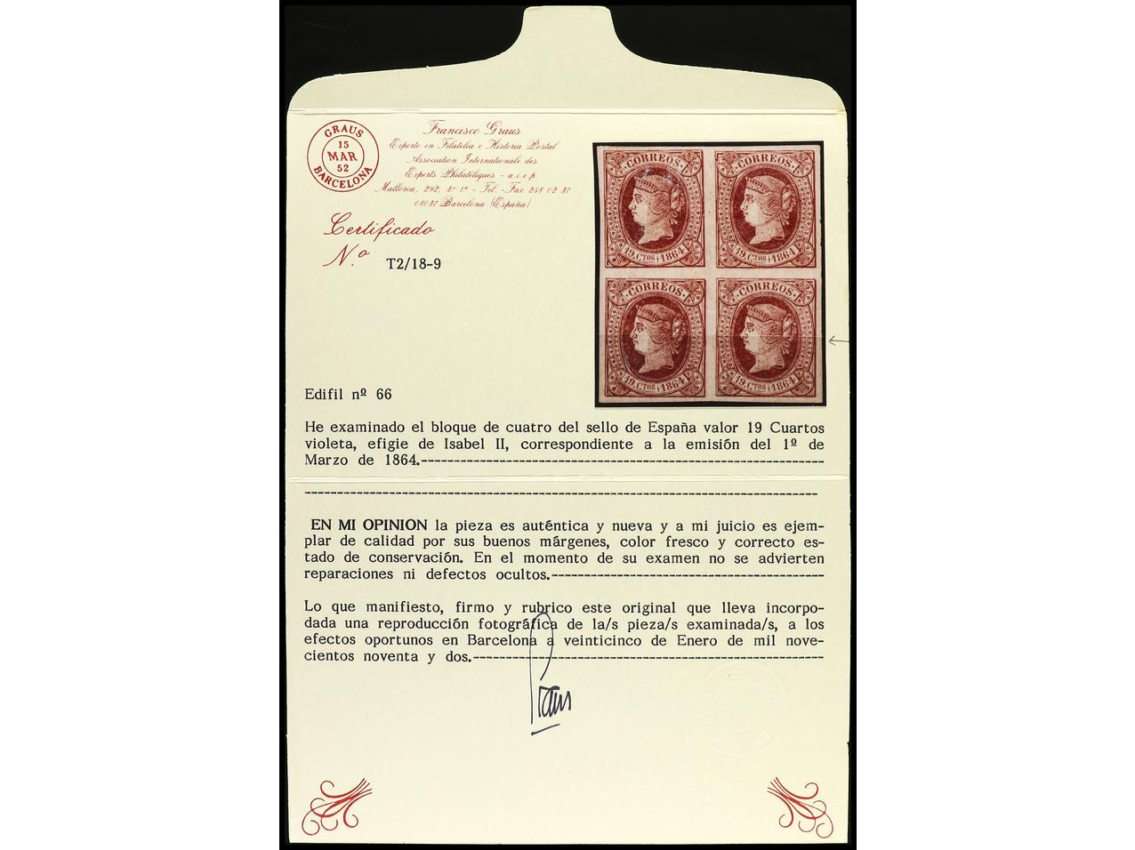 ESPAÑA. 19 cuartos violeta. Pareja PRECIOSA. Cert. GRAUS (fotocopia del bloque de cuatro de donde procede). Ed.66 (2). Cat. 520€. (Image1) (Image2)