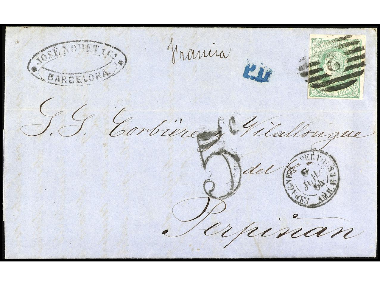 ESPAÑA. 1864. BARCELONA a FRANCIA. 12 cuartos verde, FALSO POSTAL, Tipo II (tipografiado). RARO en carta. (Graus 81 II). Ed.65F. (Image1) (Image2)