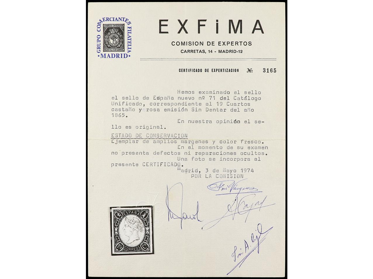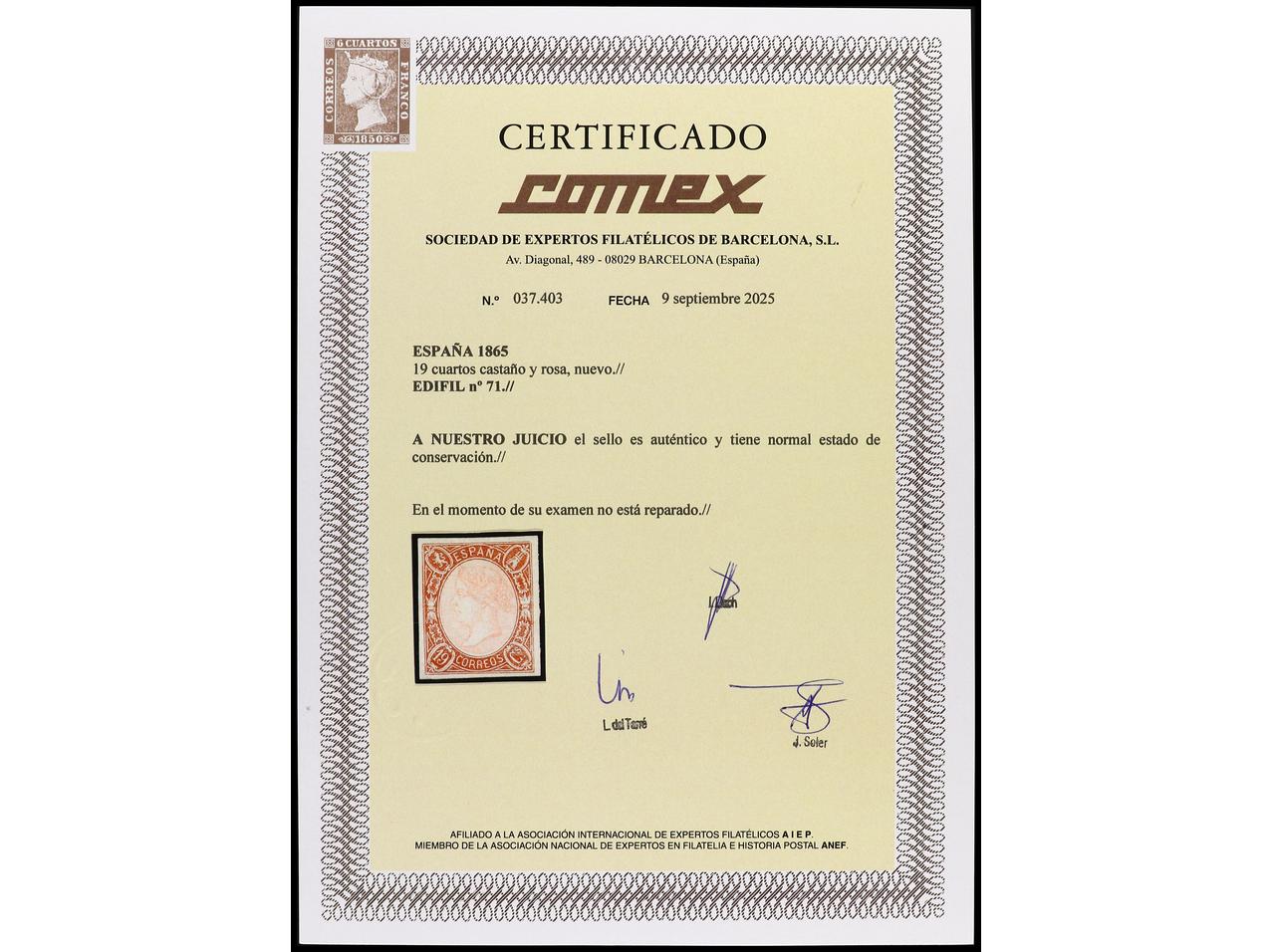 ESPAÑA. 19 cuartos castaño y rosa. Raro en esta calidad. Cert. COMEX. Ed.71. Cat. 2.000€. (Image1) (Image2)