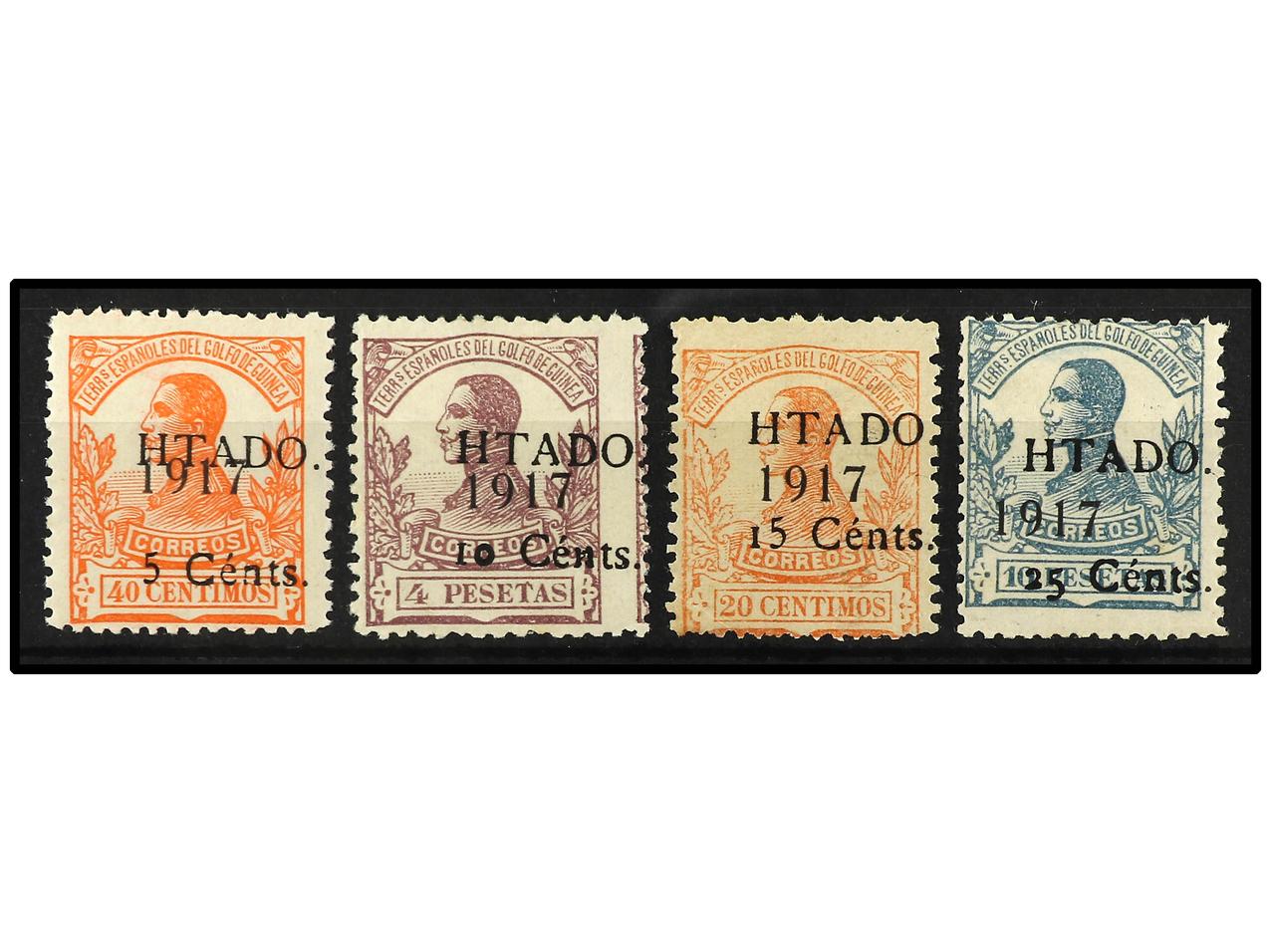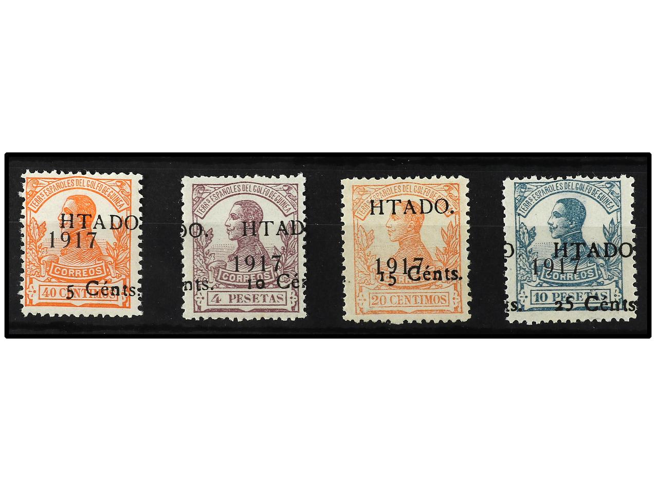 COLONIAS ESPAÑOLAS: GUINEA. SERIE COMPLETA, 4 valores. 25 cts. sobre 10 cts. pliegue original de la goma. Centrado habitual. Ed.124/7. Cat. 300€.