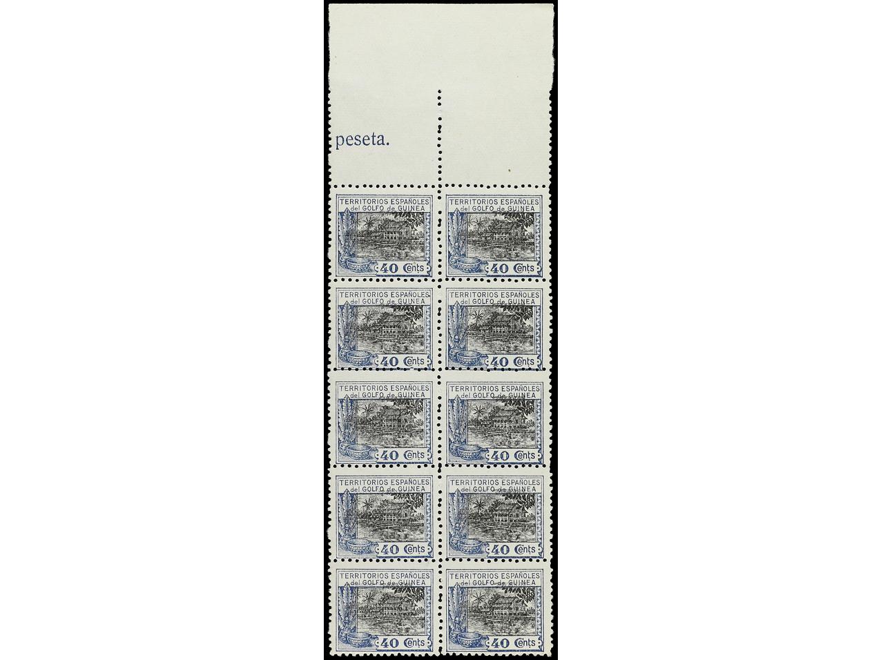 COLONIAS ESPAÑOLAS: GUINEA. 40 céntimos azul y negro. DOBLE IMPRESIÓN DEL CENTRO. Bloque de 10. Ed.173ed. Cat. 1.480€. (Image1)