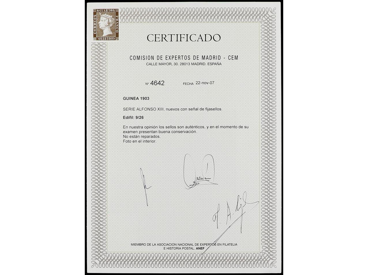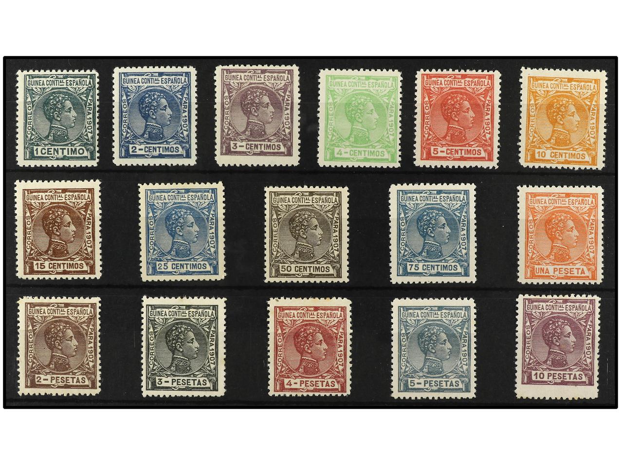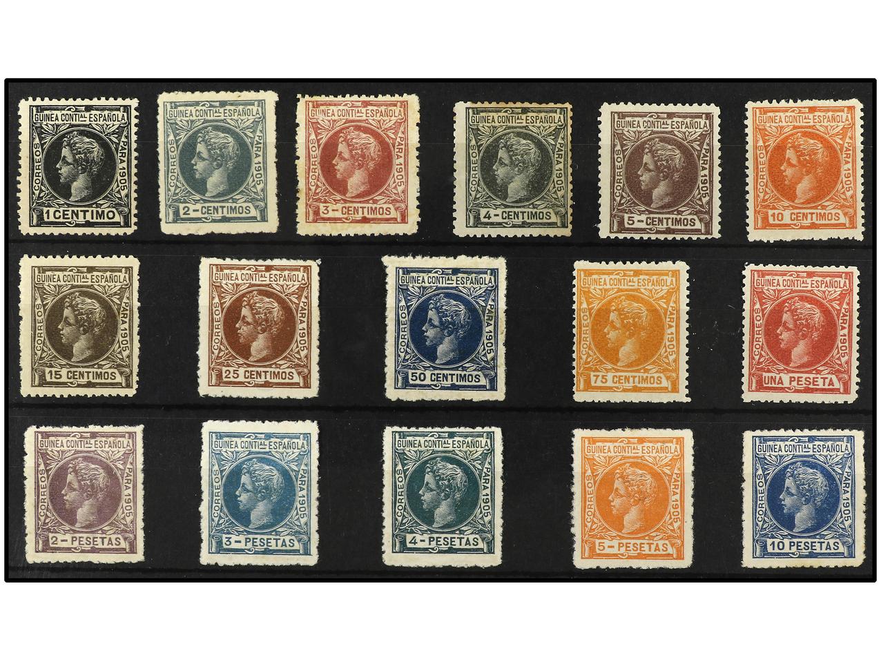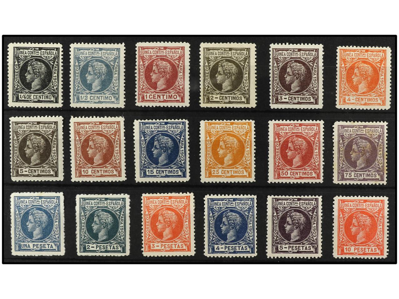COLONIAS ESPAÑOLAS: GUINEA. SERIE COMPLETA, 18 valores. RARA. Mayoría numeración ceros. 75 cts. y 3 pesetas sombras del tiempo. Cert. CEM. Ed.9/26. Cat. 1.400€.
