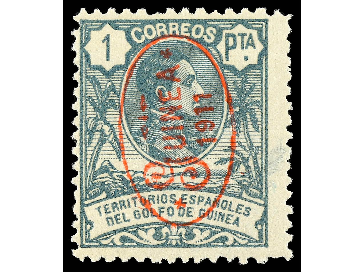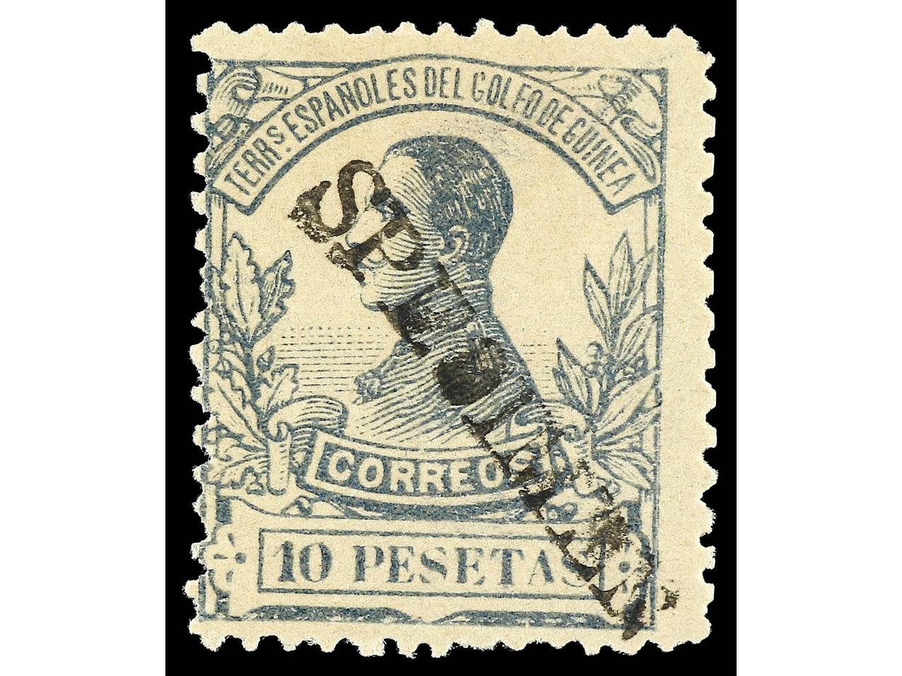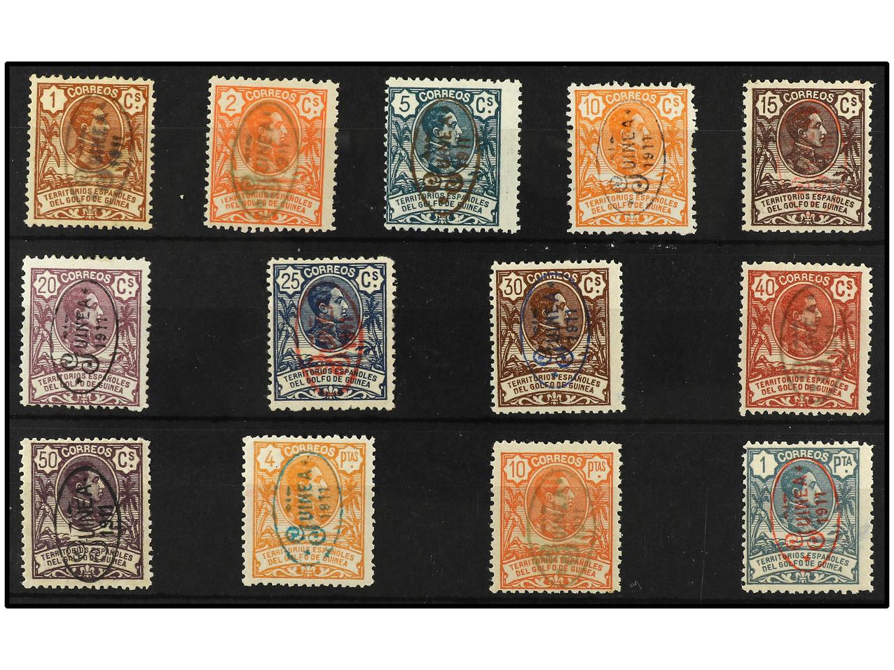 COLONIAS ESPAÑOLAS: GUINEA. JUEGO COMPLETO. 11 valores (no existen el 1 y 2 cts.). HABILITACIÓN EN COLOR AZUL. RARA. Ed.113/23hcc. Cat. +387€.