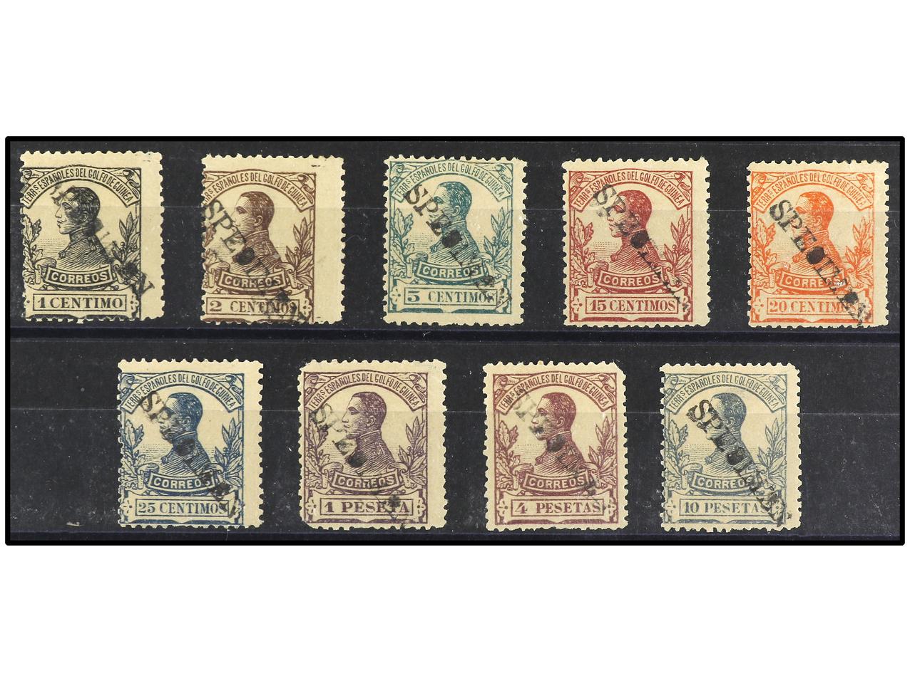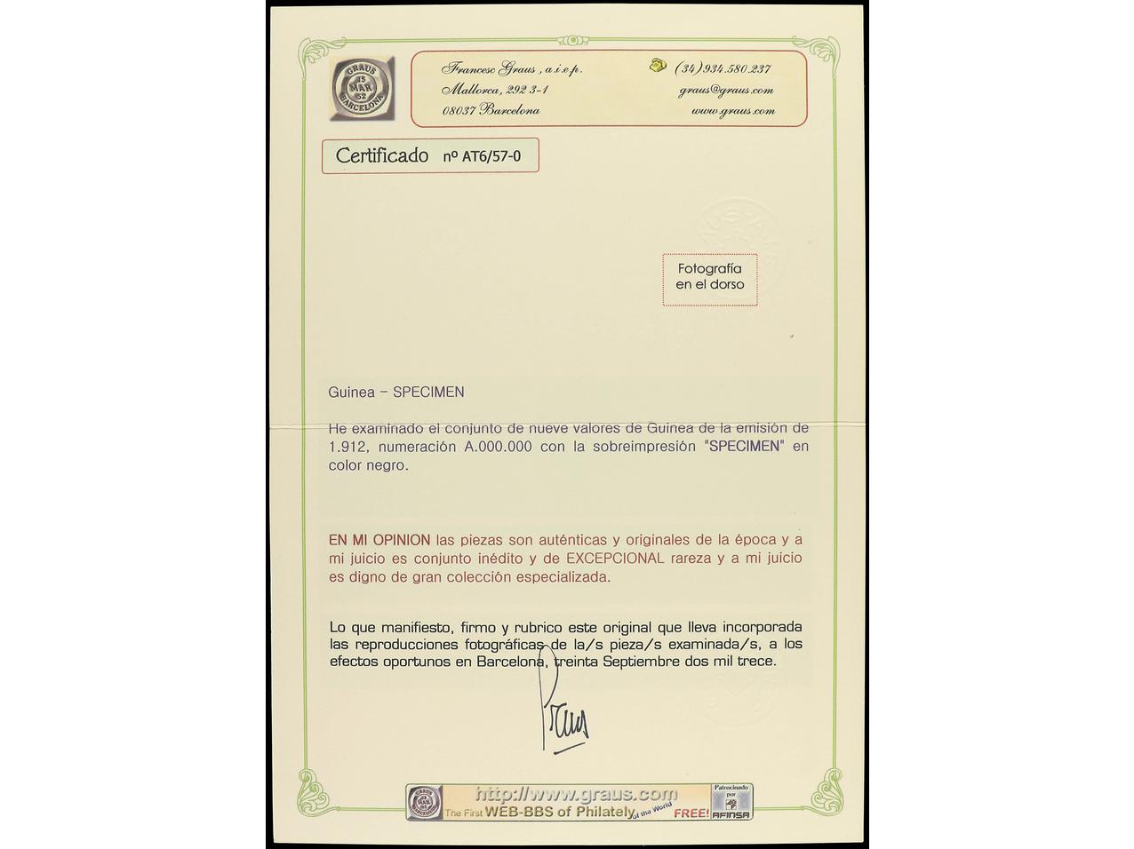 COLONIAS ESPAÑOLAS: GUINEA. 9 valores con numeración A 000.000 y sobreimpresión SPECIMEN en negro. 1 y 4 defecto en dentado. CONJUNTO INÉDITO y de EXCEPCIONAL RAREZA. Cert. GRAUS. Ed.85/7, 89/91 y 95/7. (Image1) (Image2)