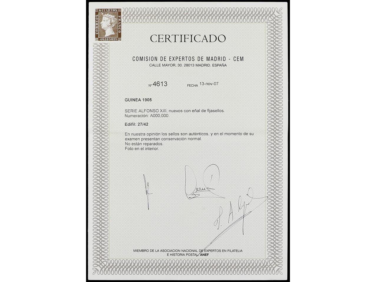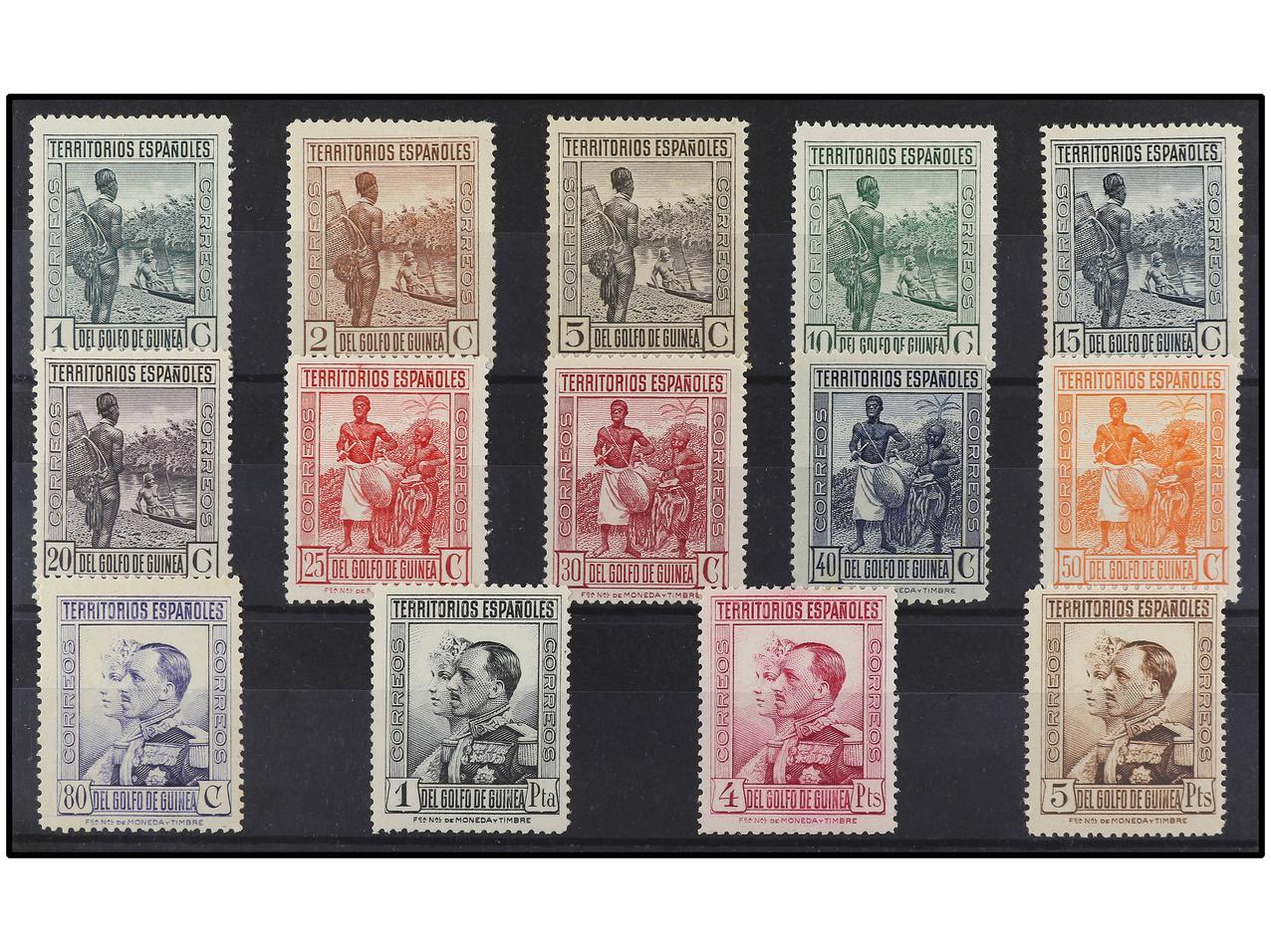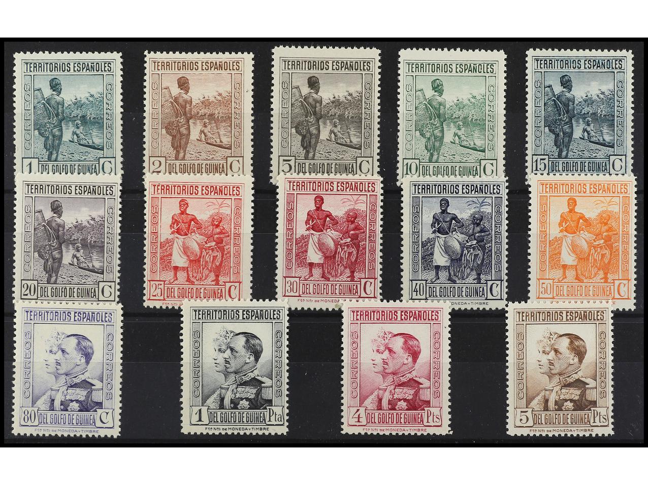 COLONIAS ESPAÑOLAS: GUINEA. SERIE COMPLETA, 16 valores. Numeración A 000.000. Mayoría bien centrados. RARA. Cert. CEM. Ed.27/42. Cat. +1.200€.