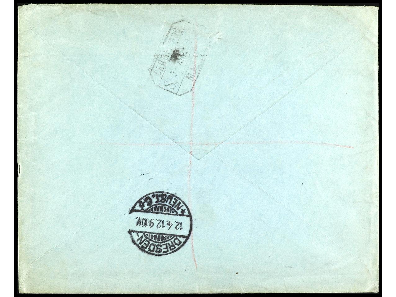 COLONIAS ESPAÑOLAS: GUINEA. 1912. Sobre CERTIFICADO de BATA a DRESDEN (Alemania), circulado con la serie completa de 1909 (excepto 5 c.), mat. fechador y llegada al dorso. MUY RARO. Ed.59, 60, 62/71. (Image1) (Image2)