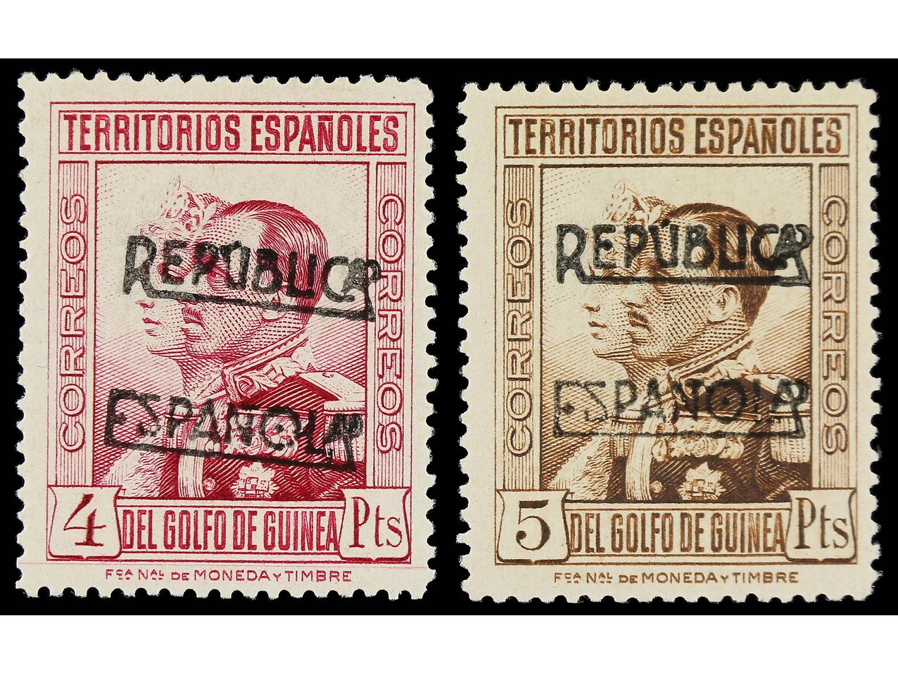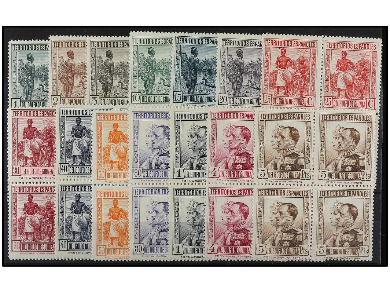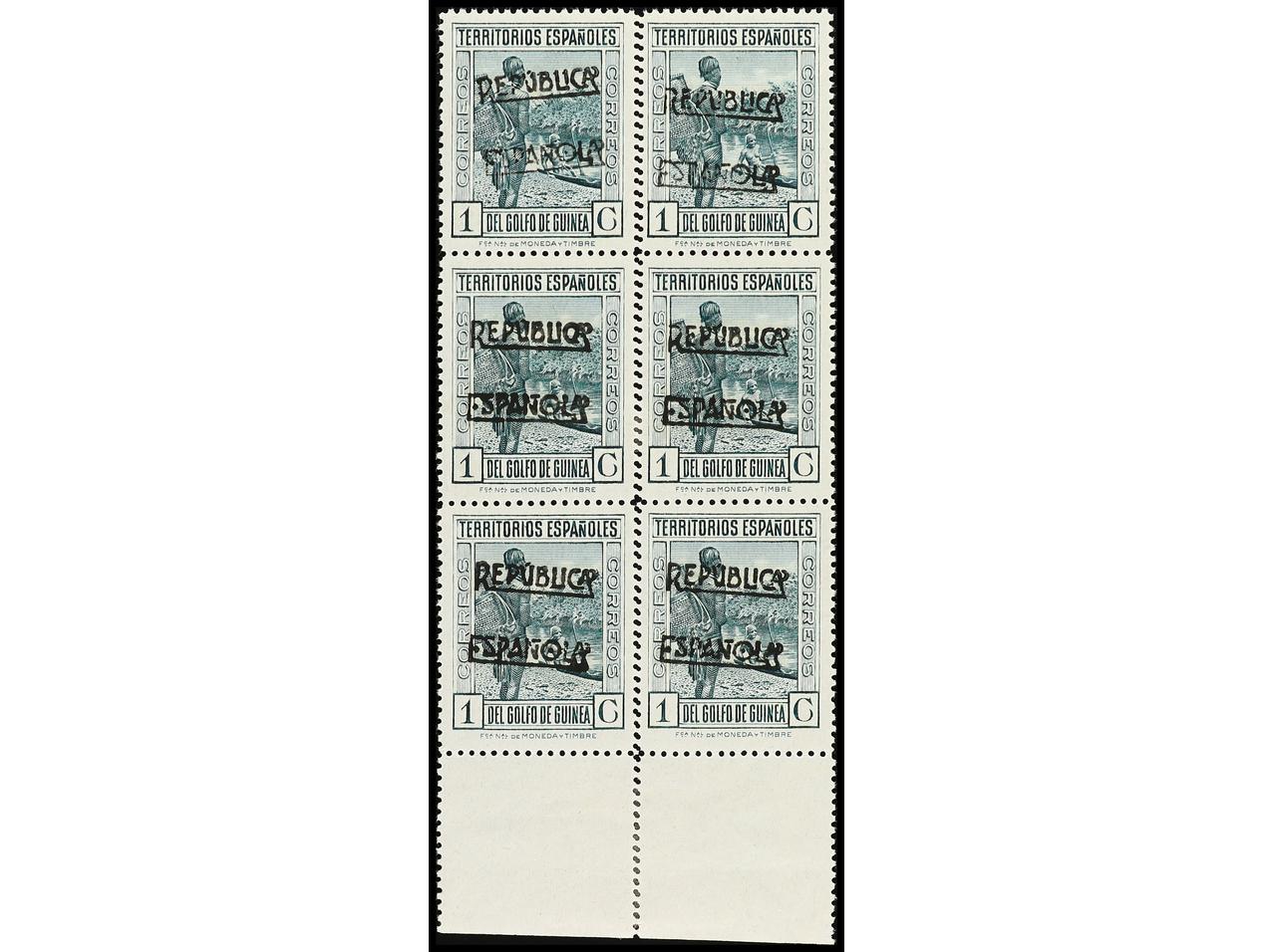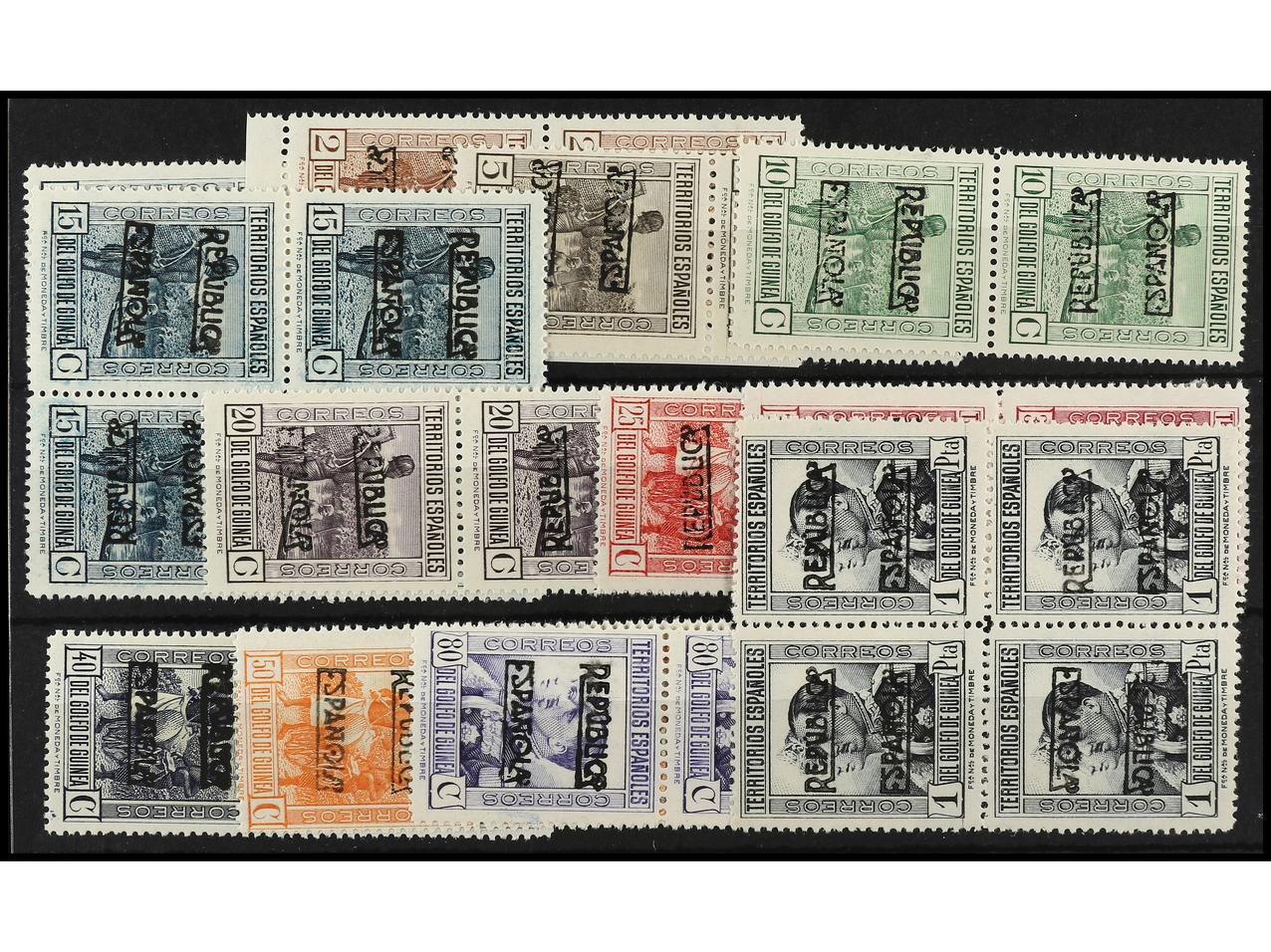 COLONIAS ESPAÑOLAS: GUINEA. CONJUNTO de 11 valores, parejas verticales y dos bloques de cuatro con un sello HABILITACIÓN INVERTIDA. El 80 cts. no reseñado. ESPECTACULAR y RARO CONJUNTO. Ed.216A/27Ahi. (Image1) (Image2)