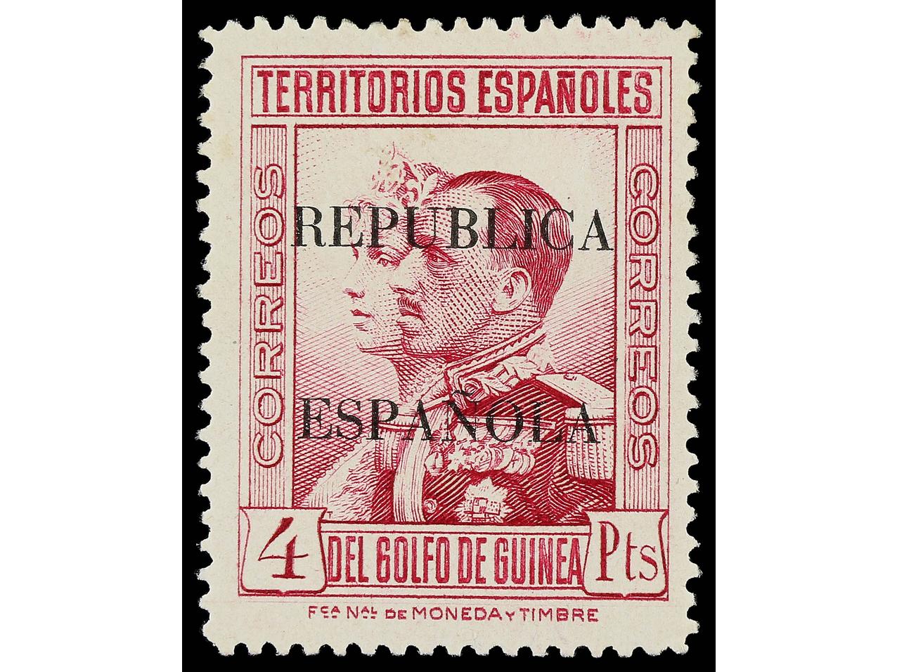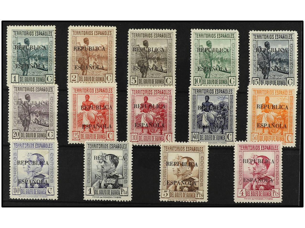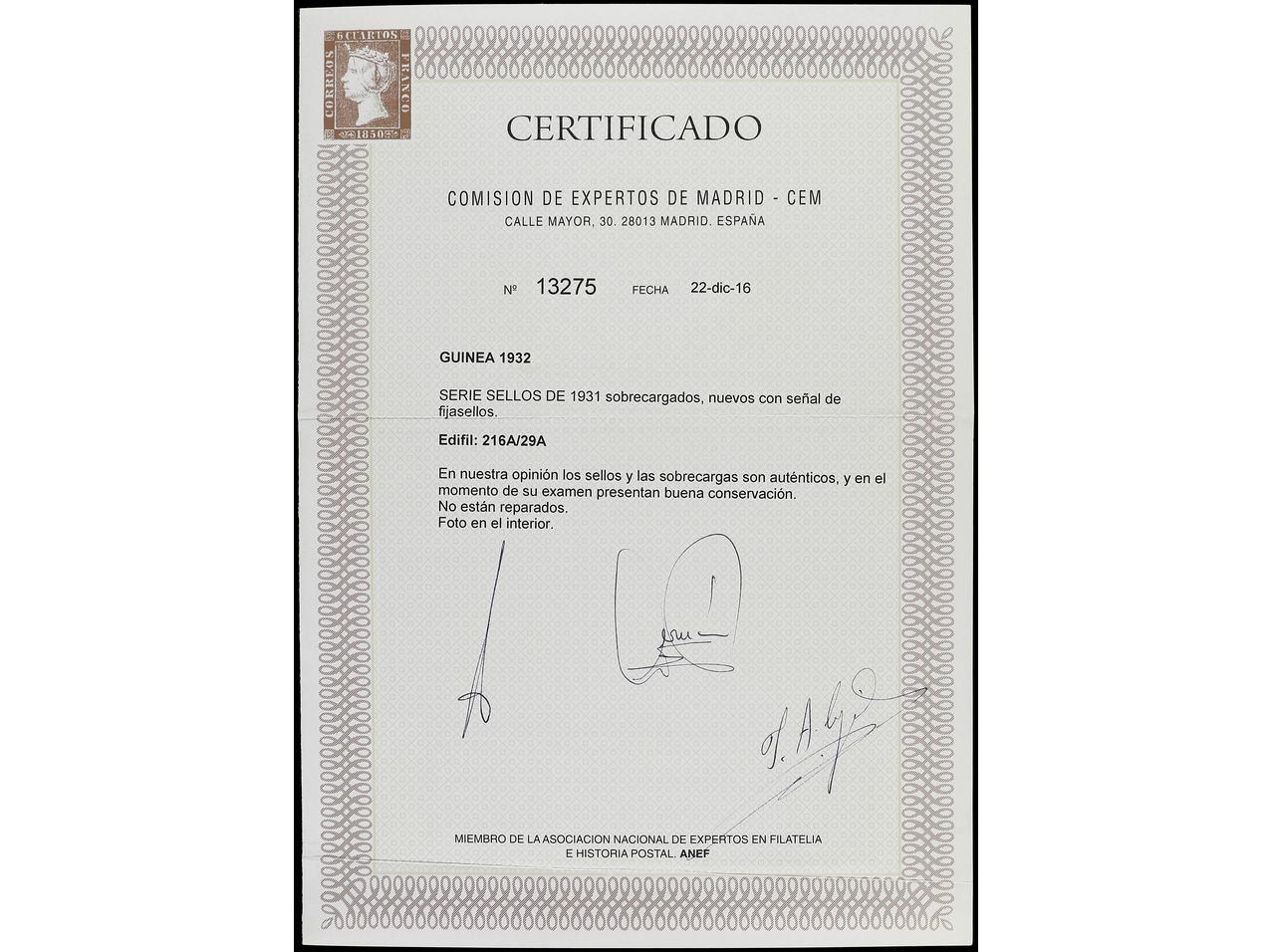 COLONIAS ESPAÑOLAS: GUINEA. SERIE COMPLETA, 14 valores con sobreimpresión a mano en negro. MAGNÍFICA y MUY RARA. Cert. CEM. Ed.216/29A. Cat. 1.110€.