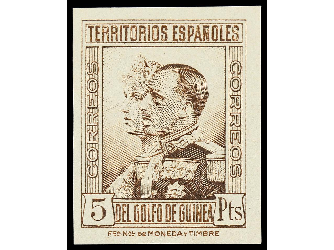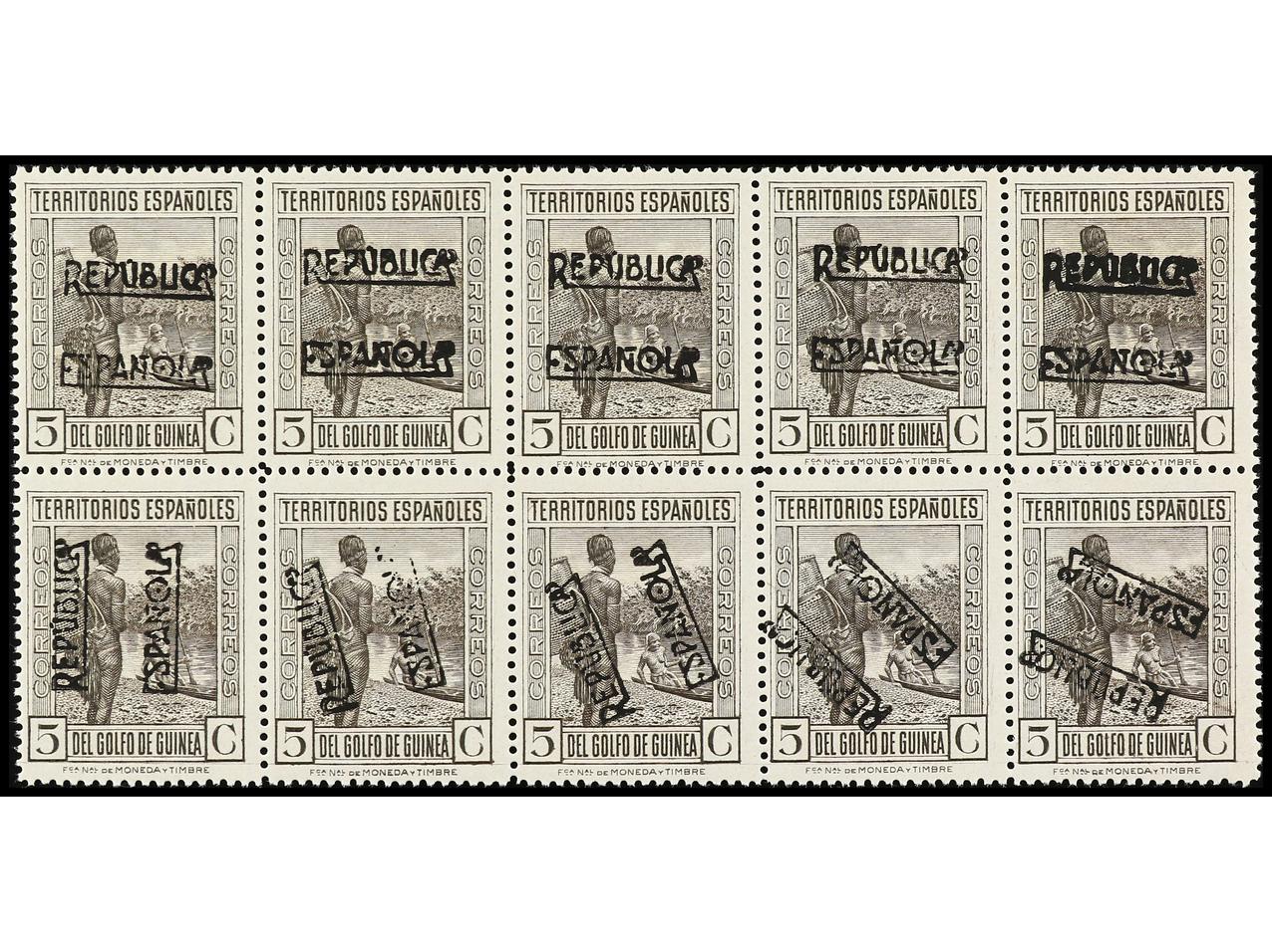 COLONIAS ESPAÑOLAS: GUINEA. 5 cts. castaño. Bloque de diez, cuatro sellos HABILITACIÓN EN DIAGONAL INVERTIDA y un sello en VERTICAL. RARO CONJUNTO. Ed.218Ahi, 218Ahh. (Image1)