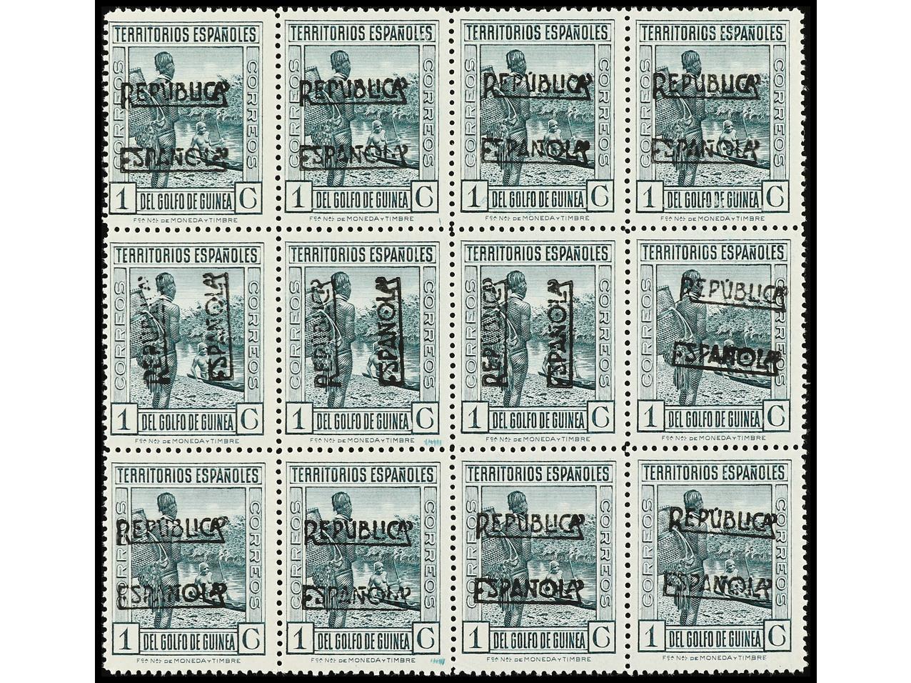 COLONIAS ESPAÑOLAS: GUINEA. 1 cto. verde. Bloque de doce, tres sellos HABILITACIÓN VERTICAL. Ed.216Ahi. (Image1)