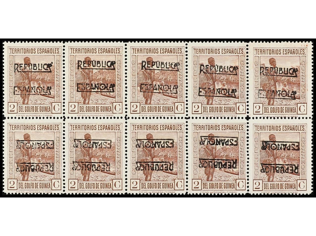 COLONIAS ESPAÑOLAS: GUINEA. 2 cts. castaño. Bloque de diez, cinco sellos HABILITACIÓN INVERTIDA. Ed.217Ahi. (Image1)