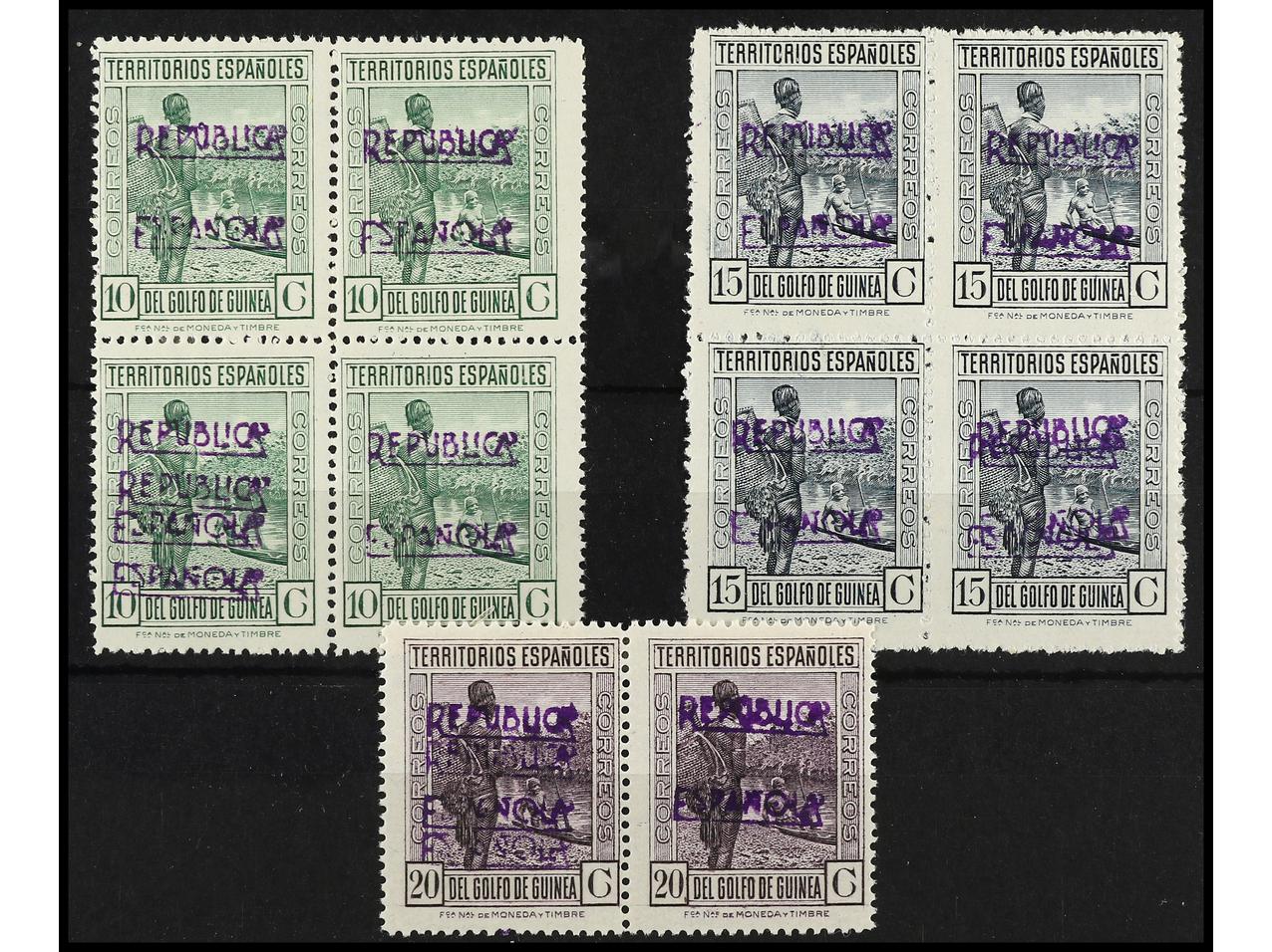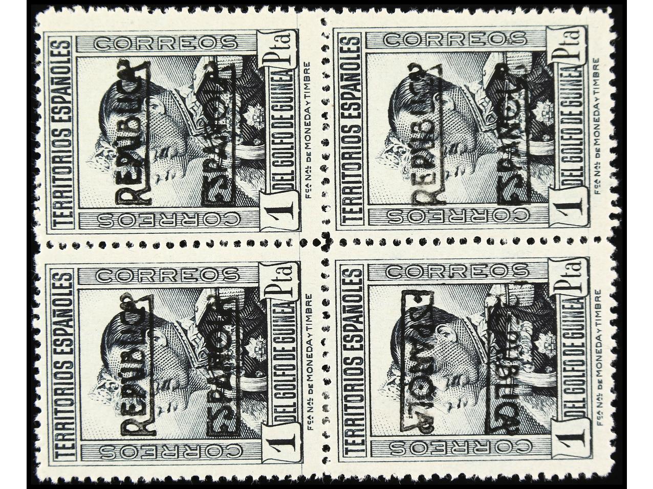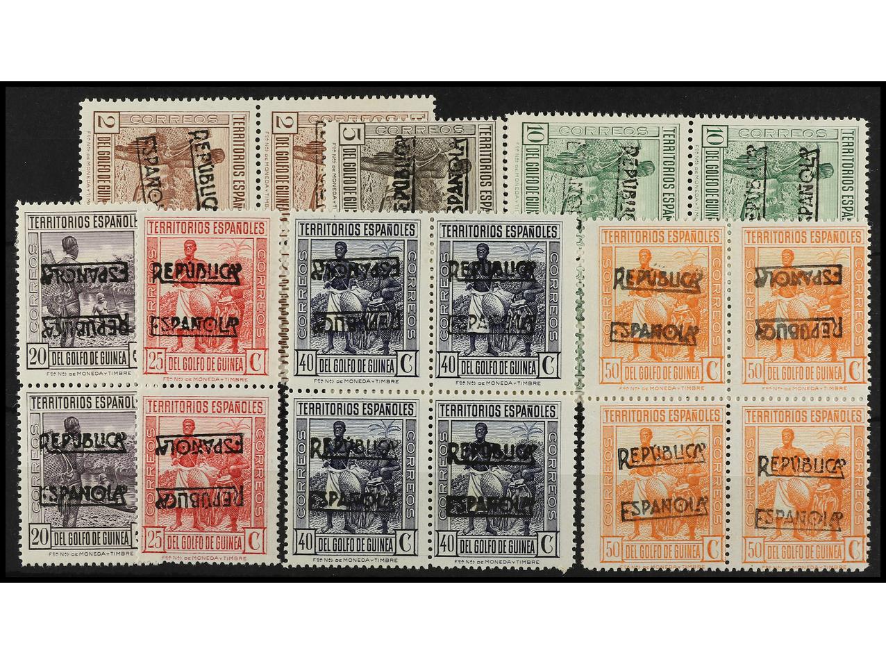 COLONIAS ESPAÑOLAS: GUINEA. CONJUNTO de cinco bloques de cuatro y dos parejas, un sello HABILITACIÓN INVERTIDA. RARO CONJUNTO. Ed.217A/19Ahi, 22A/22Ahi, 224A/25Ahi. (Image1) (Image2)